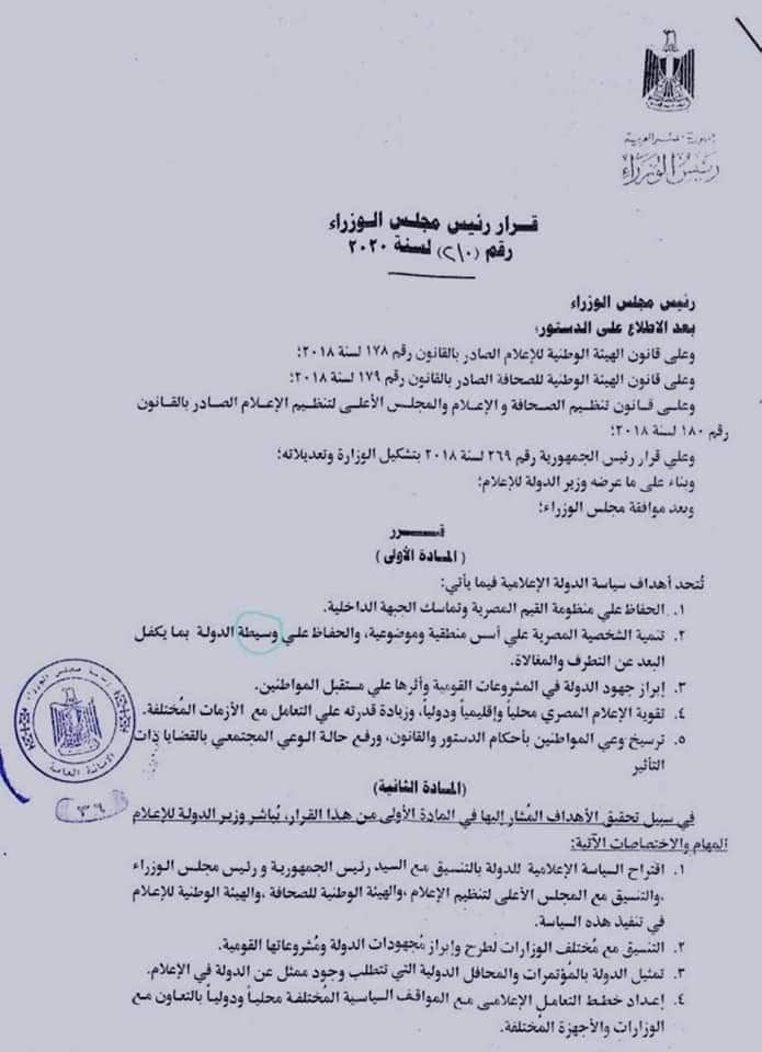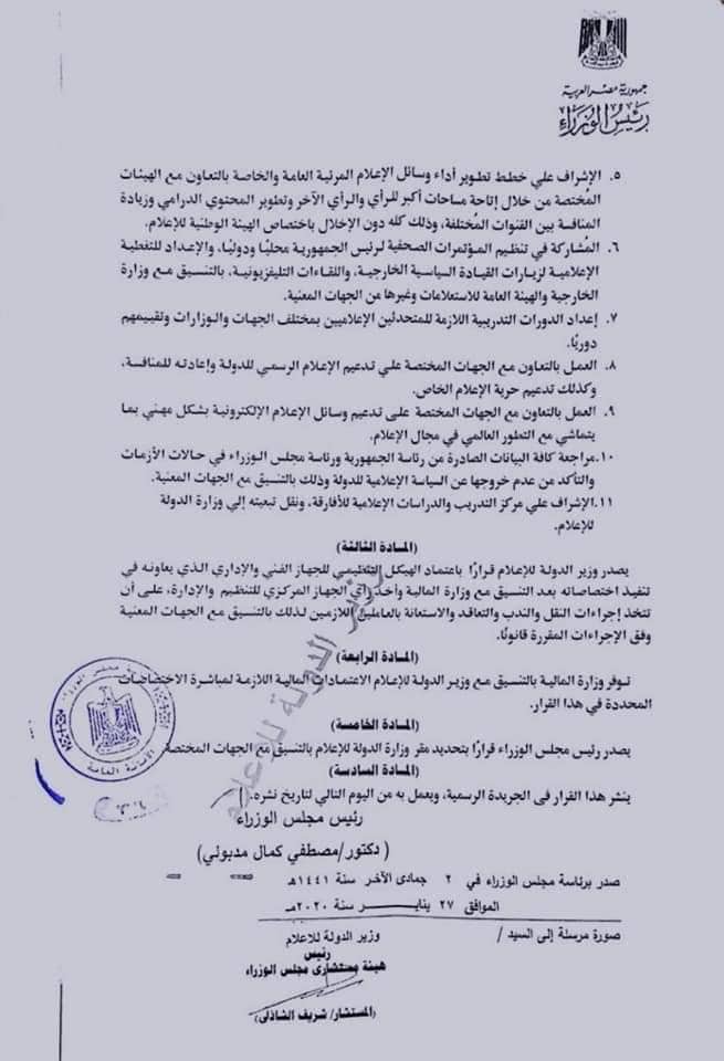 كما ينص القرار على أن يُصدر رئيس مجلس الوزراء قراراً بتحديد مقر وزارة الدولة للإعلام بالتنسيق مع الجهات المختصة.