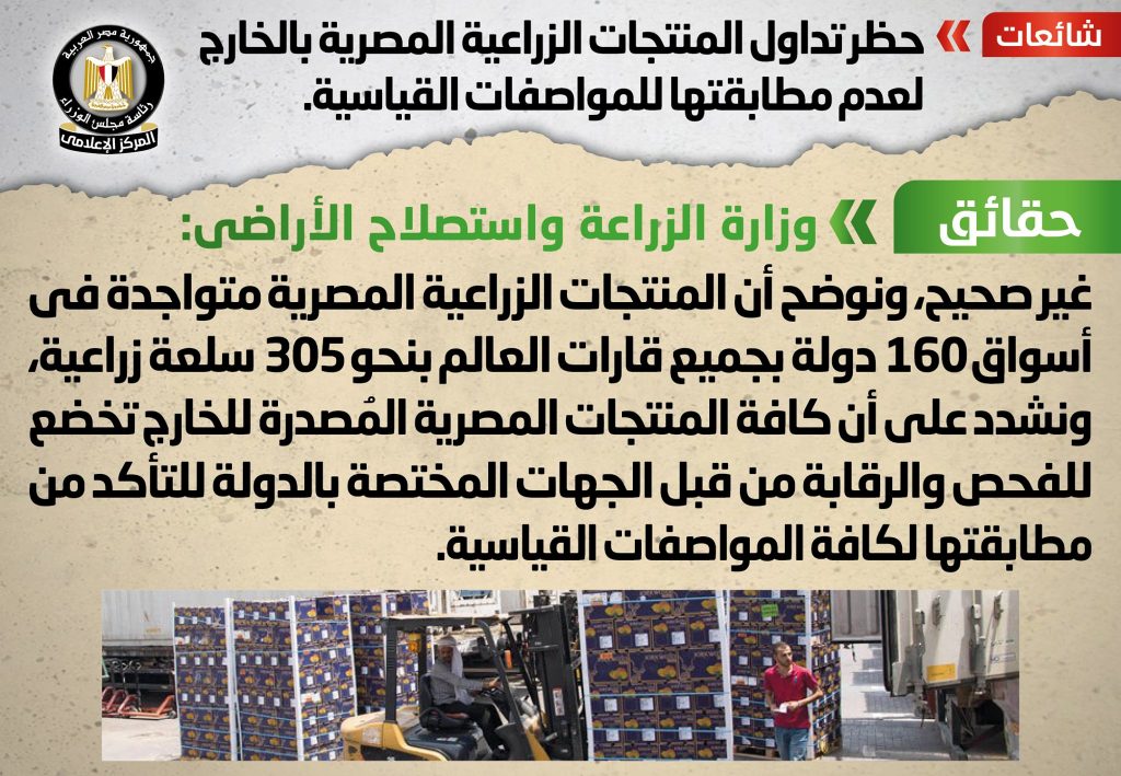تداولت بعض وسائل الإعلام والمواقع الإلكترونية وصفحات التواصل الاجتماعي أنباء بشأن حظر تداول المنتجات الزراعية المصرية بالخارج لعدم مطابقتها للمواصفات القياسية، وقد قام المركز الإعلامي لمجلس الوزراء بالتواصل مع وزارة الزراعة واستصلاح الأراضي، والتي نفت تلك الأنباء، مُؤكدةً أنه لا صحة لحظر تداول المنتجات الزراعية المصرية بالخارج لعدم مطابقتها للمواصفات القياسية، مُوضحةً أن المنتجات الزراعية المصرية متواجدة في أسواق 160 دولة بجميع قارات العالم بنحو 305 سلعة زراعية، مشددةً على أن كافة المنتجات المصرية المُصدرة للخارج تخضع للفحص والرقابة من قبل الجهات المختصة بالدولة للتأكد من مطابقتها لكافة المواصفات القياسية.