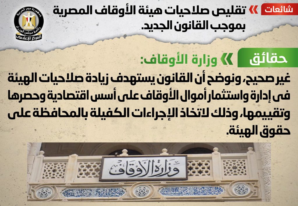 أثير في بعض وسائل الإعلام والمواقع الإلكترونية وصفحات التواصل الاجتماعي أنباء بشأن تقليص صلاحيات هيئة الأوقاف المصرية بموجب القانون الجديد، وقد قام المركز الإعلامي لمجلس الوزراء بالتواصل مع وزارة الأوقاف، والتي نفت تلك الأنباء، مُؤكدةً أنه لا صحة لتقليص صلاحيات هيئة الأوقاف المصرية بموجب القانون الجديد، موضحةً أن القانون يستهدف زيادة صلاحيات الهيئة في إدارة واستثمار أموال الأوقاف على أسس اقتصادية وحصرها وتقييمها، وذلك لاتخاذ الإجراءات الكفيلة بالمحافظة على حقوق الهيئة.