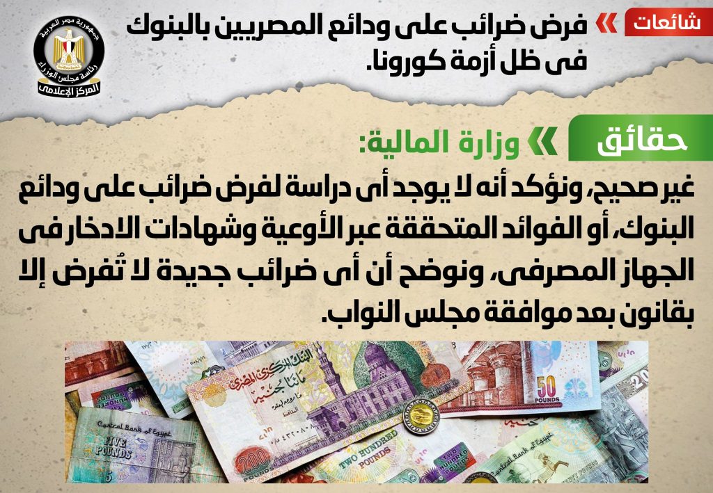 تداولت بعض المواقع الإلكترونية وصفحات التواصل الاجتماعي أنباء بشأن فرض ضرائب على ودائع المصريين بالبنوك في ظل أزمة كورونا، وقد قام المركز الإعلامي لمجلس الوزراء بالتواصل مع وزارة المالية، والتي نفت تلك الأنباء، مُؤكدةً أنه لا يوجد أي دراسة لفرض ضرائب على ودائع البنوك، أو الفوائد المتحققة عبر الأوعية وشهادات الادخار في الجهاز المصرفي، موضحةً أن أي ضرائب جديدة لا تُفرض إلا بقانون بعد موافقة مجلس النواب.