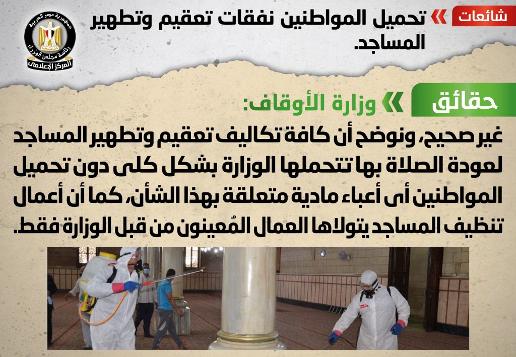 تداولت بعض المواقع الإلكترونية وصفحات التواصل الاجتماعي أنباء بشأن تحميل المواطنين نفقات تعقيم وتطهير المساجد، وقد قام المركز الإعلامي لمجلس الوزراء بالتواصل مع وزارة الأوقاف، والتي نفت تلك الأنباء، مُؤكدةً أنه لا صحة لتحميل المواطنين نفقات تعقيم وتطهير المساجد، مُوضحةً أن كافة تكاليف تعقيم وتطهير المساجد لعودة الصلاة بها تتحملها الوزارة بشكل كلي دون تحميل المواطنين أي أعباء مادية متعلقة بهذا الشأن، كما أن أعمال تنظيف المساجد يتولاها العمال المُعينون من قبل الوزارة فقط.