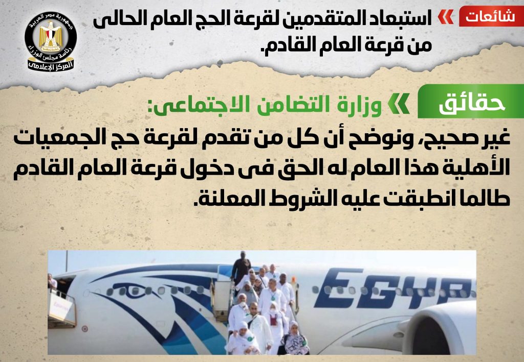 انتشر في بعض المواقع الإلكترونية وصفحات التواصل الاجتماعي أنباء بشأن استبعاد المتقدمين لقرعة الحج العام الحالي من قرعة العام القادم، وقد قام المركز الإعلامي لمجلس الوزراء بالتواصل مع وزارة التضامن الاجتماعي، والتي نفت تلك الأنباء، مُؤكدةً أنه لا صحة لاستبعاد المتقدمين لقرعة الحج العام الحالي من قرعة العام القادم، مُوضحةً أن كل من تقدم لقرعة حج الجمعيات الأهلية هذا العام له الحق في دخول قرعة العام القادم طالما انطبقت عليه الشروط المعلنة، وذلك في إطار الحفاظ على حقوق المتقدمين للحج.