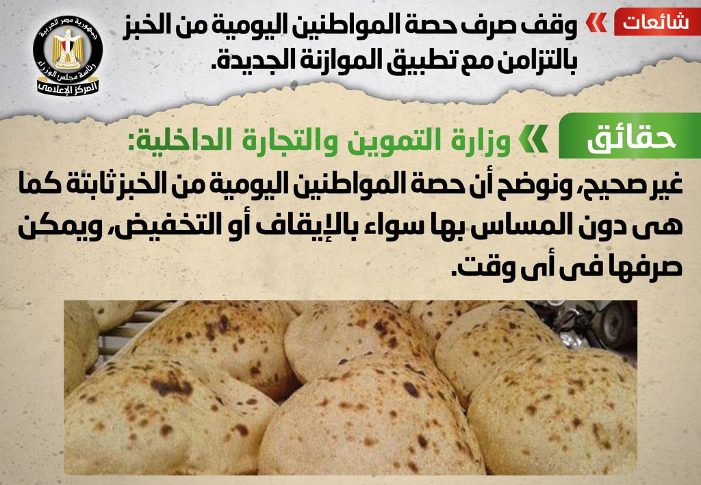 أثير في بعض المواقع الإلكترونية وصفحات التواصل الاجتماعي أنباء بشأن وقف صرف حصة المواطنين اليومية من الخبز بالتزامن مع تطبيق الموازنة الجديدة، وقد قام المركز الإعلامي لمجلس الوزراء بالتواصل مع وزارة التموين والتجارة الداخلية، والتي نفت تلك الأنباء، مؤكدةً أن حصة المواطنين اليومية من الخبز ثابتة كما هي دون المساس بها سواء بالإيقاف أو التخفيض، ويمكن صرفها في أي وقت.
