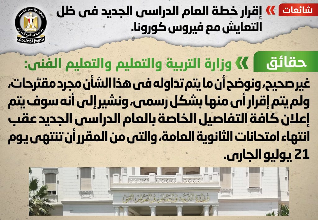 انتشر في بعض المواقع الإلكترونية وصفحات التواصل الاجتماعي أنباء بشأن إقرار خطة العام الدراسي الجديد في ظل التعايش مع فيروس كورونا، وقد قام المركز الإعلامي لمجلس الوزراء بالتواصل مع وزارة التربية والتعليم والتعليم الفني، والتي نفت تلك الأنباء، مُؤكدةً أنه لا صحة لإقرار أي خطط للعام الدراسي الجديد من قبل الوزارة، مُوضحةً أن ما يتم تداوله في هذا الشأن مجرد مقترحات، ولم يتم إقرار أي منها بشكل رسمي، مُشيرةً إلى أنه سوف يتم إعلان كافة التفاصيل الخاصة بالعام الدراسي الجديد عقب انتهاء امتحانات الثانوية العامة، والتي من المقرر أن تنتهي يوم ٢١ يوليو الجاري.