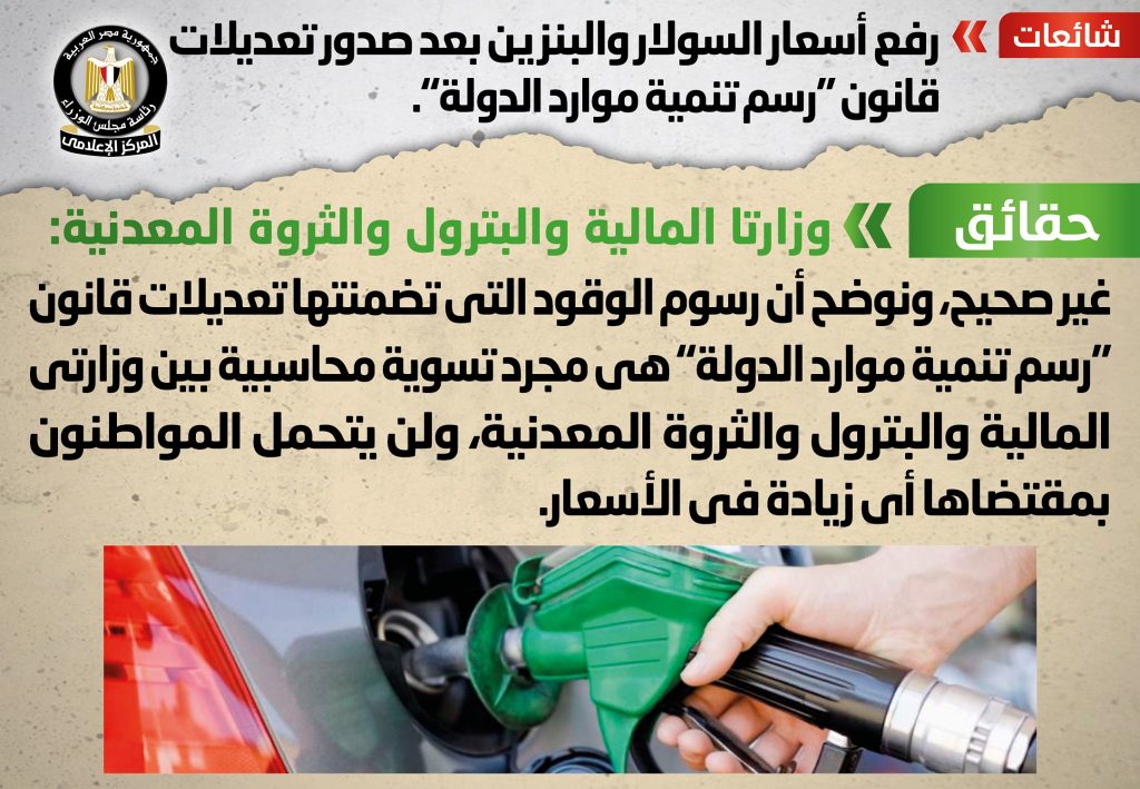 تداولت بعض المواقع الإلكترونية وصفحات التواصل الاجتماعي أنباء بشأن رفع أسعار السولار والبنزين بعد صدور تعديلات قانون “رسم تنمية موارد الدولة”، وقد قام المركز الإعلامي لمجلس الوزراء بالتواصل مع وزارتي المالية والبترول والثروة المعدنية، وأكدت الوزارتان أنه لا صحة لرفع أسعار بيع السولار والبنزين للمستهلك، وأن رسوم الوقود التي تضمنتها تعديلات قانون “رسم تنمية موارد الدولة” هي مجرد تسوية محاسبية بين وزارتي المالية والبترول والثروة المعدنية، ولن يتحمل المواطنون بمقتضاها أي زيادة في الأسعار.