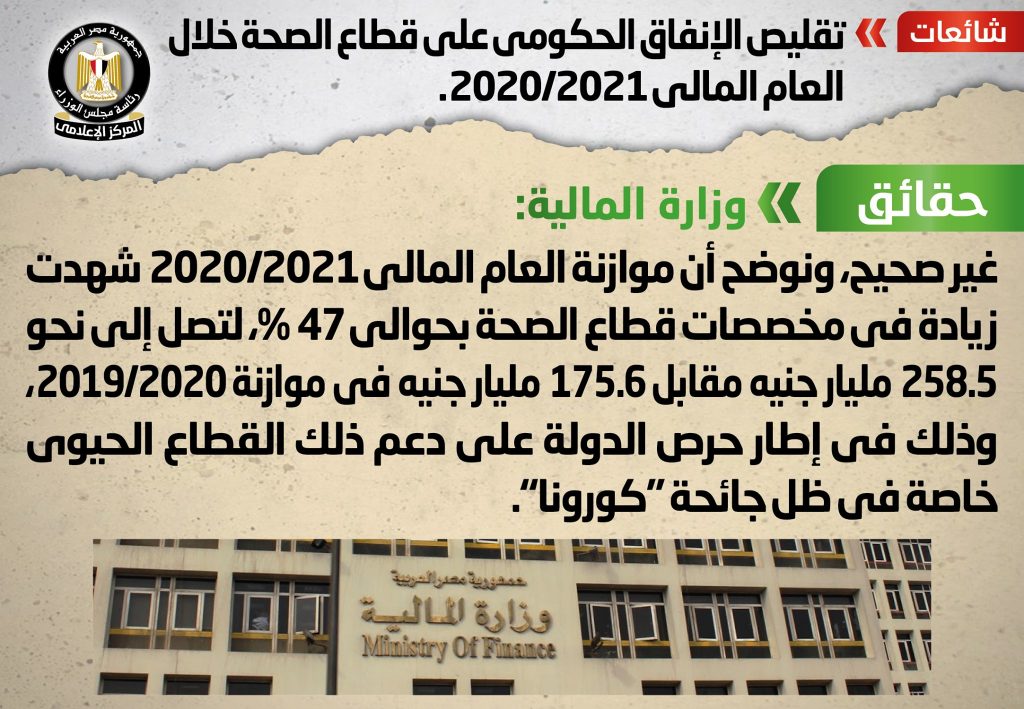 تردد في بعض وسائل الإعلام والمواقع الإلكترونية وصفحات التواصل الاجتماعي أنباء عن تقليص الإنفاق الحكومي على قطاع الصحة خلال العام المالي 2020/2021، وقد قام المركز الإعلامي لمجلس الوزراء بالتواصل مع وزارة المالية، والتي نفت تلك الأنباء، مُؤكدةً أنه لا صحة لتقليص الإنفاق الحكومي على قطاع الصحة خلال العام المالي 2020/2021، مُوضحةً أن موازنة العام المالي 2020/2021 شهدت زيادة في مخصصات قطاع الصحة بحوالي 47%، لتصل إلى نحو 258.5 مليار جنيه مقابل 175.6 مليار جنيه في موازنة 2019/2020، وذلك في إطار حرص الدولة على دعم ذلك القطاع الحيوي خاصة في ظل جائحة “كورونا”.