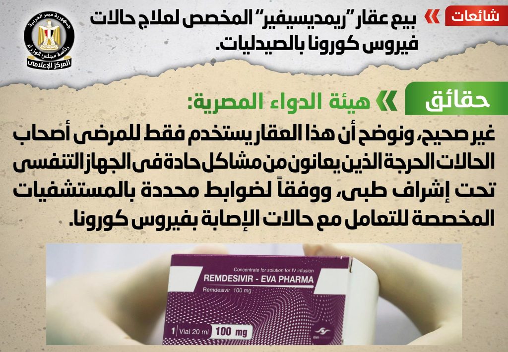 تردد في بعض وسائل الإعلام والمواقع الإلكترونية وصفحات التواصل الاجتماعي أنباء بشأن بيع عقار “ريمديسيفير” المخصص لعلاج حالات فيروس كورونا بالصيدليات، وقد قام المركز الإعلامي لمجلس الوزراء بالتواصل مع هيئة الدواء المصرية، والتي نفت تلك الأنباء، مُؤكدةً أنه لا صحة لبيع عقار “ريمديسيفير” بأي صيدلية من الصيدليات، موضحةً أن هذا العقار يستخدم فقط للمرضى أصحاب الحالات الحرجة الذين يعانون من مشاكل حادة في الجهاز التنفسي تحت إشراف طبي، ووفقاً لضوابط محددة بالمستشفيات المخصصة للتعامل مع حالات الإصابة بفيروس كورونا.