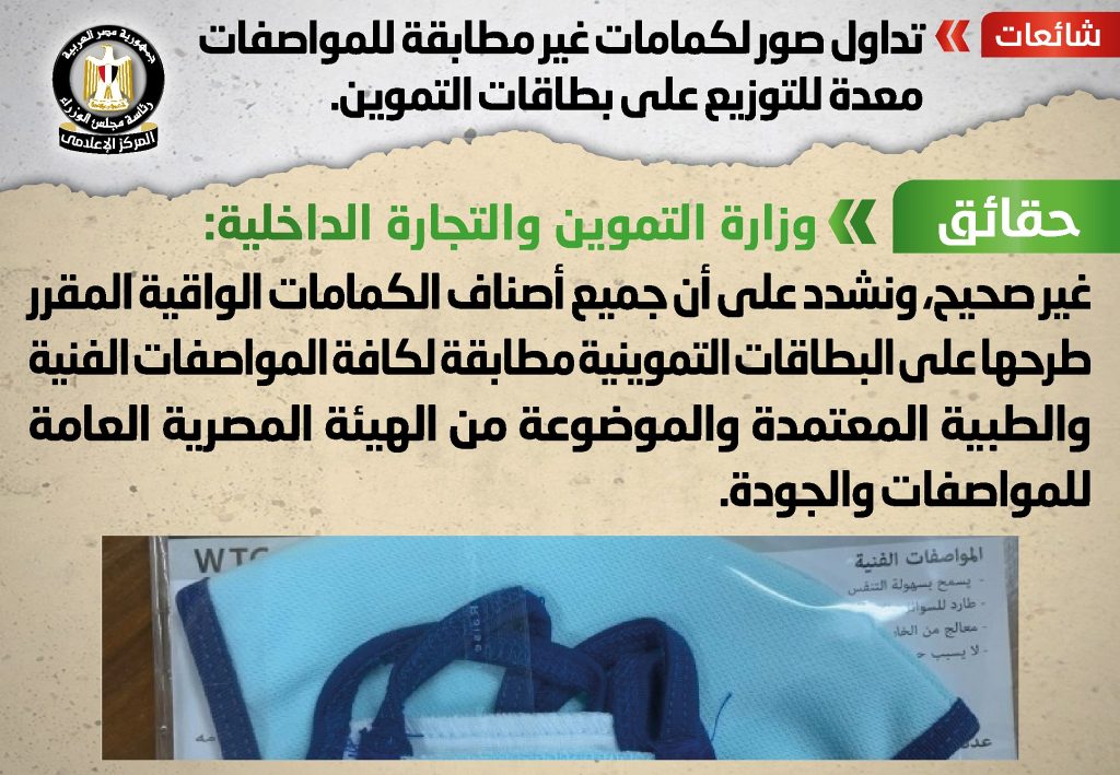تداولت بعض المواقع الإلكترونية وصفحات التواصل الاجتماعي صوراً لكمامات غير مطابقة للمواصفات معدة للتوزيع على بطاقات التموين، وقد قام المركز الإعلامي لمجلس الوزراء بالتواصل مع وزارة التموين والتجارة الداخلية، والتي نفت تلك الأنباء، مُؤكدةً أنه لا صحة لطرح أي كمامات غير مطابقة للمواصفات على البطاقات التموينية، مُشددةً على أن جميع أصناف الكمامات الواقية المقرر طرحها على البطاقات التموينية مطابقة لكافة المواصفات الفنية والطبية المعتمدة والموضوعة من الهيئة المصرية العامة للمواصفات والجودة.