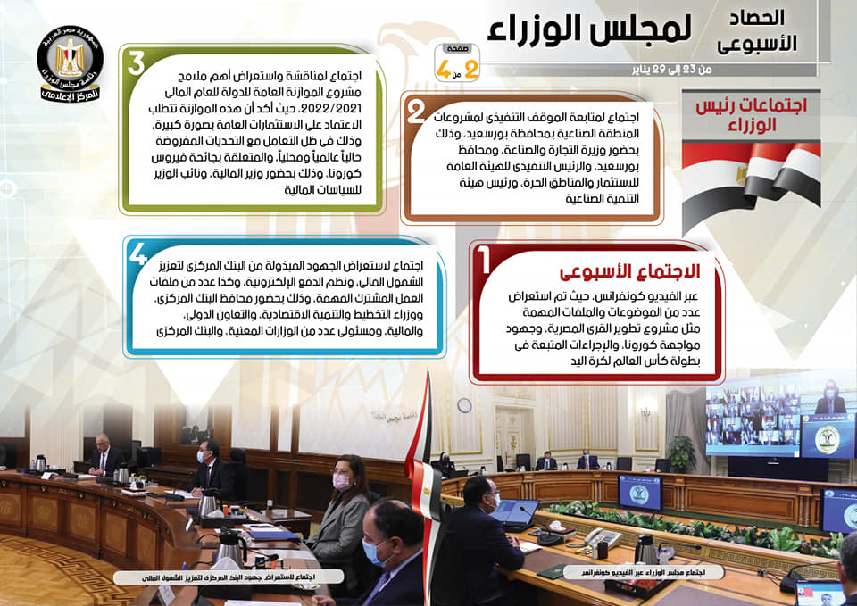 وعلى صعيد الاجتماعات التي عقدها مصطفى مدبولي رئيس مجلس الوزراء، أوضح التقرير أنه تم عقد اجتماع لمتابعة الموقف التنفيذي لمشروعات المنطقة الصناعية بمحافظة بورسعيد، وذلك بحضور وزيرة التجارة والصناعة، ومحافظ بورسعيد، والرئيس التنفيذي للهيئة العامة للاستثمار والمناطق الحرة، ورئيس هيئة التنمية الصناعية، بالإضافة لعقد اجتماع لمناقشة واستعراض أهم ملامح مشروع الموازنة العامة للدولة للعام المالي 2021/2022، حيث أكد سيادته أن هذه الموازنة تتطلب الاعتماد على الاستثمارات العامة بصورة كبيرة، وذلك في ظل التعامل مع التحديات المفروضة حالياً عالمياً ومحلياً، والمتعلقة بجائحة فيروس كورونا، وذلك بحضور وزير المالية، ونائب الوزير للسياسات المالية.