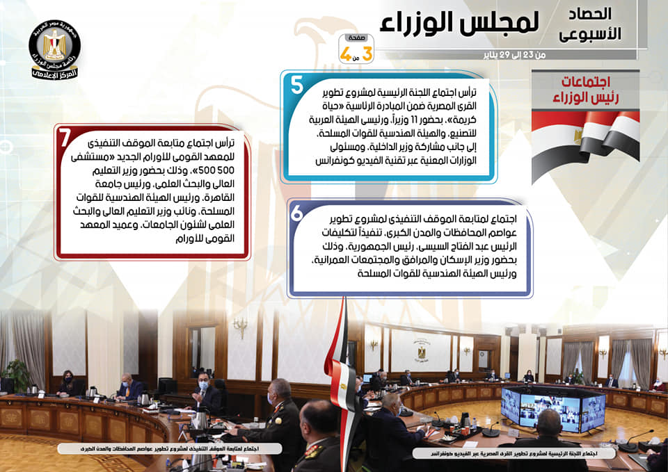 كما شملت اجتماعات السيد رئيس مجلس الوزراء، وفقاً للتقرير، اجتماعاً لمتابعة الموقف التنفيذي لمشروع تطوير عواصم المحافظات والمدن الكبرى، تنفيذاً لتكليفات الرئيس عبد الفتاح السيسي، رئيس الجمهورية، وذلك بحضور وزير الإسكان والمرافق والمجتمعات العمرانية، ورئيس الهيئة الهندسية للقوات المسلحة، إلى جانب الاجتماع الأسبوعي عبر الفيديو كونفرانس، حيث تم استعراض عدد من الموضوعات والملفات المهمة مثل مشروع تطوير القرى المصرية، وجهود مواجهة كورونا، والإجراءات المتبعة في بطولة كأس العالم لكرة اليد. كما ترأس سيادته اجتماعاً لمتابعة الموقف التنفيذي للمعهد القومي للأورام الجديد “مستشفى 500 500″، وذلك بحضور وزير التعليم العالي والبحث العلمي، ورئيس جامعة القاهرة، ورئيس الهيئة الهندسية للقوات المسلحة، ونائب وزير التعليم العالي والبحث العلمي لشئون الجامعات، وعميد المعهد القومي للأورام.