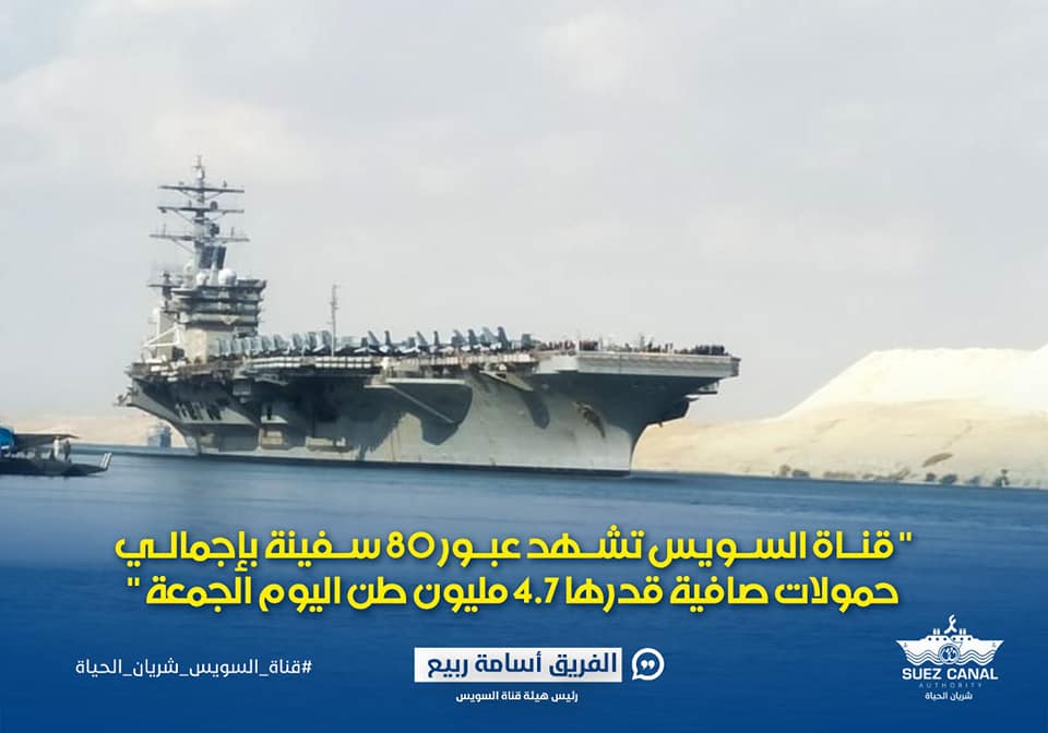 وأوضح رئيس الهيئة أن حركة الملاحة بالقناة، تشهد اليوم الجمعة، عبور عدة سفن ووحدات بحرية عملاقة أبرزها حاملة الطائرات الأمريكية DWIGHT EISENHOWER التي تعبر القناة ضمن قافلة الشمال، بالإضافة إلى ناقلة الغاز الطبيعي المسال LI JMILIYA التي تعبر أيضا من ذات القافلة بالقناة الأصلية بحمولة كلية قدرها ١٧١ ألف طن ، فيما تعبر ناقلة البترول KIDAN ضمن قافلة الجنوب بالمجرى الملاحي الجديد للقناة بحمولة كلية ١٦٤ ألف طن مما يؤكد على الثقة الكبيرة التي يوليها المجتمع الملاحي الدولي في قناة السويس وقدرة مصر على توفير الأمن والأمان للأنواع المختلفة من السفن ولحركة التجارة العالمية المارة عبر القناة.