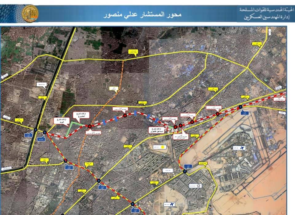حيث اطلع السيسي علي محور المستشار عدلي منصور الذي تم إنشائه بعرض ١٦ حارة مرورية بواقع ٨ حارة لكل اتجاه ويشتمل على عدد ٦ كباري سيارات و عدد ٥ كبارى مشاه، وحيث يربط المحور طرق الاسماعلية الصحراوي وبلبيس وشرق القاهرة مع مناطق غرب وشمال القاهرة ومناطق محافظة القليوبية ومحاور شبرا بنها وتحيا مصر والضبعة وطريق الاسكندرية الصحراوي، الأمر الذي يمثل شريانا مروريا جديدا سيحدث تطويرا وانفراجة كبيرة في حركة المركبات وتنقل المواطنين ويختصر كثيراً من الوقت خاصة بعد عملية توسعة الطرق المحيطة وإزالة العديد من الإشغالات والتعديات والمواقف العشوائية على جانبي الطرق.