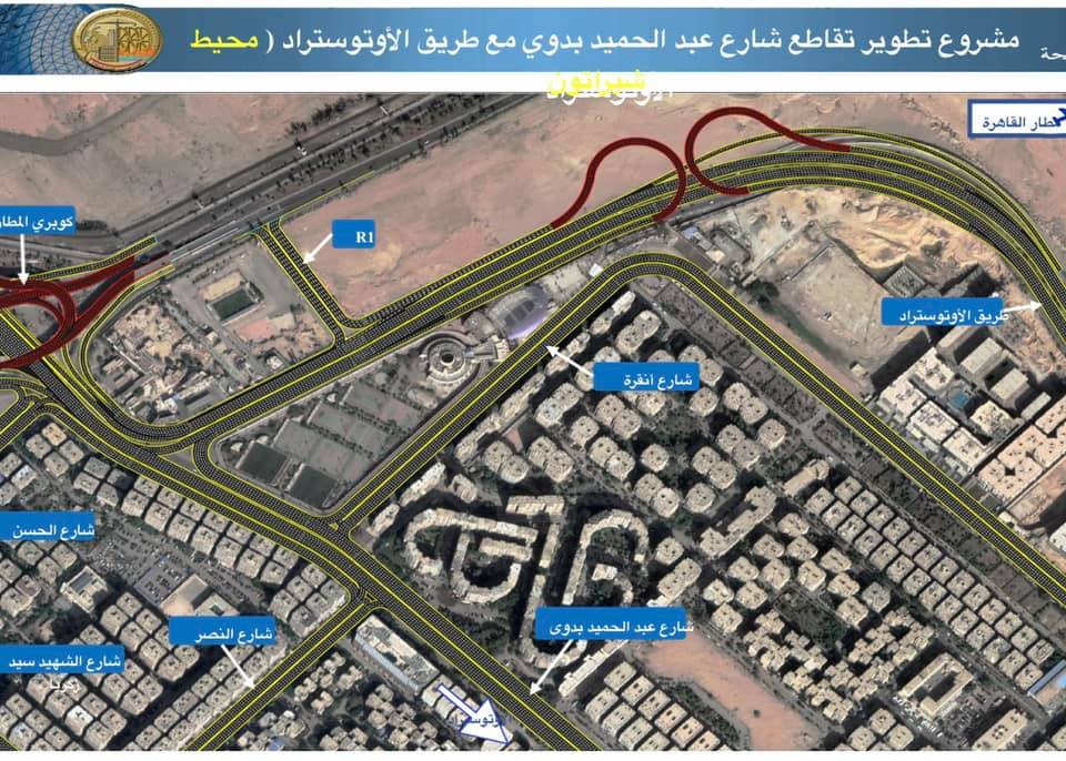 كما تفقد الرئيس كذلك أعمال التطوير في منطقة محيط مطار القاهرة الدولي مرورا بشارع عبد الحميد بدوي وتقاطعه مع طريق الأوتوستراد والذي يحتوي على عدد ٢ کوبری دوران لتيسير الحركة المرورية في المنطقة السكنية المحيطة امتدادا إلى حي مدينة نصر مع توسعة طريق الأوتوستراد ليصبح ٦ حارة مرورية لكل اتجاه و كذلك توسعة شارع عبد الحميد بدوى ليصبح ٦ حارة مرورية لكل اتجاه وكذلك توسعة و رفع كفاءة الطرق الداخلية للأحياء السكنية المحيطة لتتكامل مع التطوير الكلي لشبكة الطرق بالمنطقة.
