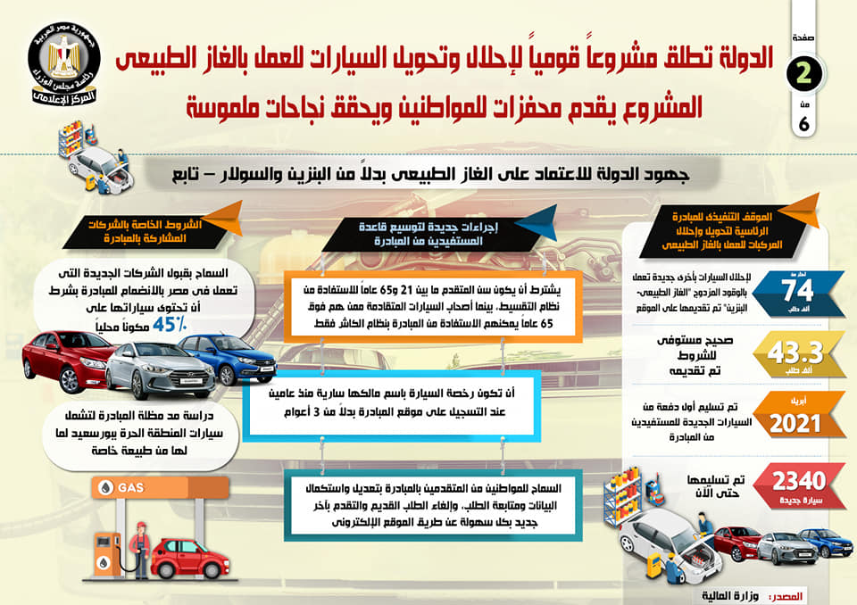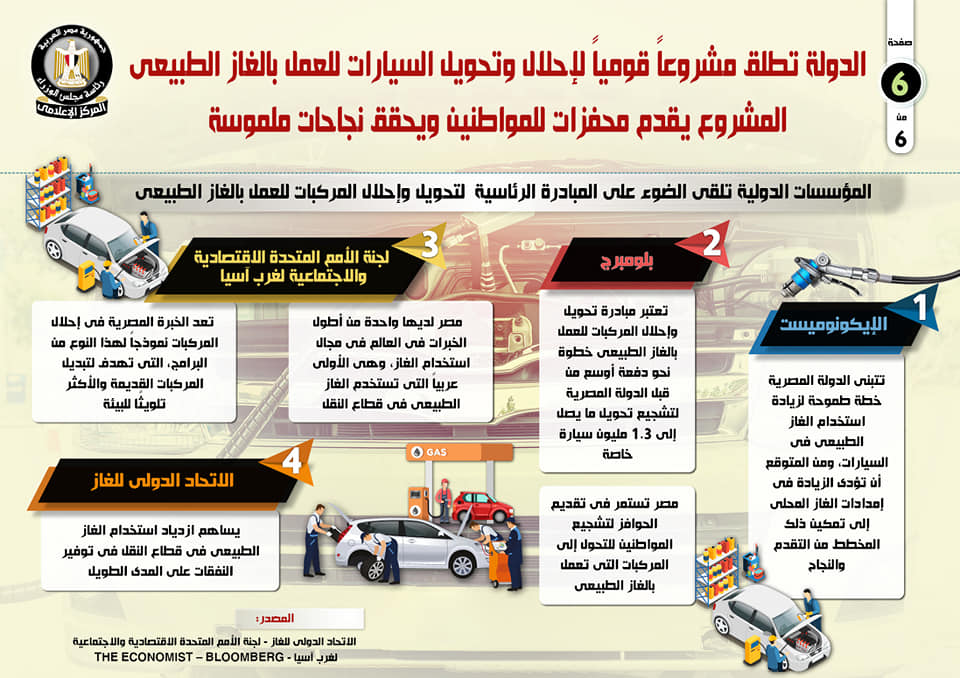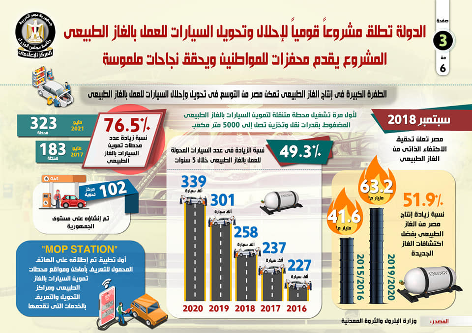 وفي هذا الصدد، نشر المركز الإعلامي لمجلس الوزراء، تقريراً تضمن إنفوجرافات تسلط الضوء على المشروع القومي لإحلال وتحويل السيارات للعمل بالغاز الطبيعي، وما يقدمه من محفزات للمواطنين وما حققه من نجاحات ملموسة.