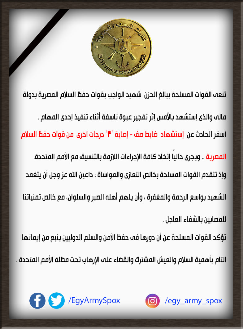 نعت القوات المسلحة، ببالغ الحزن شهيد الواجب بقوات حفظ السلام المصرية بدولة مالى، والذى استشهد بالأمس، إثر تفجير عبوة ناسفه أثناء تنفيذ إحدى المهام .