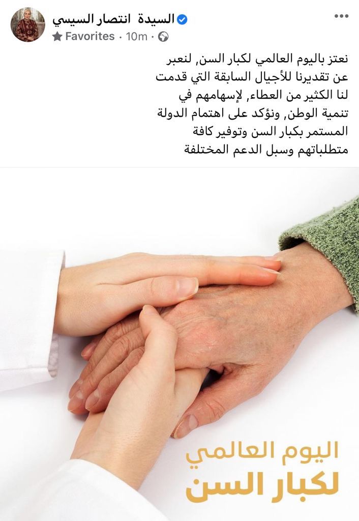 وقالت السيدة انتصار السيسي، في تدوينة لها على صفحتها الشخصية على مواقع التواصل الاجتماعي، بمناسبة اليوم العالمي كبار السن، “نعتز باليوم العالمي لكبار السن لنعبر عن تقديرنا للأجيال السابقة التي قدمت لنا الكثير من العطاء، لإسهامهم في تنمية الوطن، ونؤكد على اهتمام الدولة المستمر بكبار السن وتوفير كافة متطلباتهم وسبل الدعم المختلفة “.