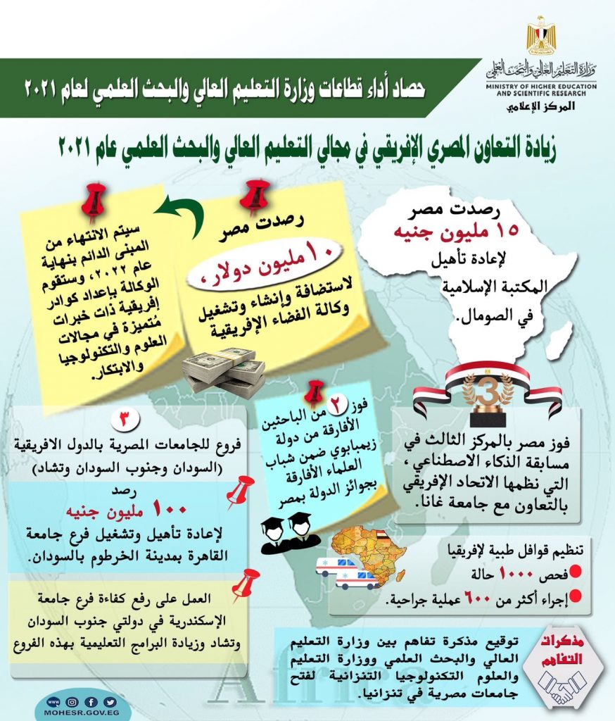 ولفت التقرير إلى أن الوزارة تسعى لربط الجامعات المصرية بنظيراتها الإفريقية، من خلال برامج شراكة وتوأمة بين الجامعات المصرية والإفريقية، حيث يتم توقيع مذكرات التفاهم ووضع خطط عمل مُشتركة وتعزيز التبادل الطلابي والأكاديمي، فضلًا عن إنشاء فروع للجامعات المصرية بالدول الإفريقية، حيث يوجد فرع لجامعة القاهرة بمدينة الخرطوم بالسودان، وتم رصد 100 مليون جنيه لإعادة تأهيل وتشغيل الفرع بكفاءة عالية، كما يوجد فرع لجامعة الإسكندرية في دولتي جنوب السودان وتشاد، ويتم العمل حاليًا على رفع كفاءة الفرعين وزيادة البرامج التعليمية بهذه الفروع، كما يتم الدراسة والتشاور حاليًا بشأن إنشاء فرع لجامعة عين شمس في جمهورية تنزانيا، فقد تم توقيع مذكرة تفاهم بين وزارة التعليم العالي والبحث العلمي ووزارة التعليم والعلوم التكنولوجيا التنزانية، خلال زيارة رئيسة جمهورية تنزانيا لمصر، خلال شهر نوفمبر، حيث تنُص مذكرة التفاهم على فتح جامعات مصرية في تنزانيا.