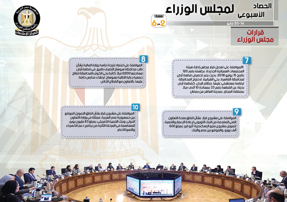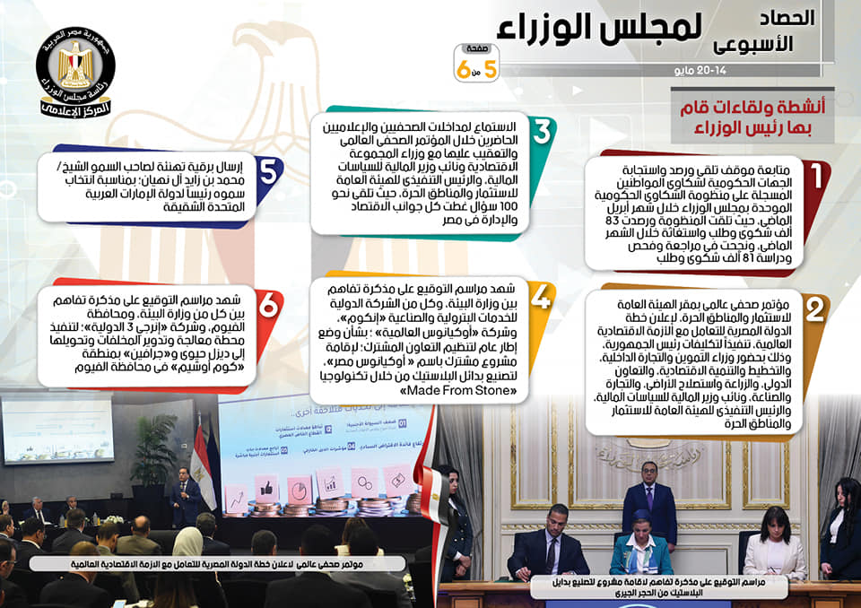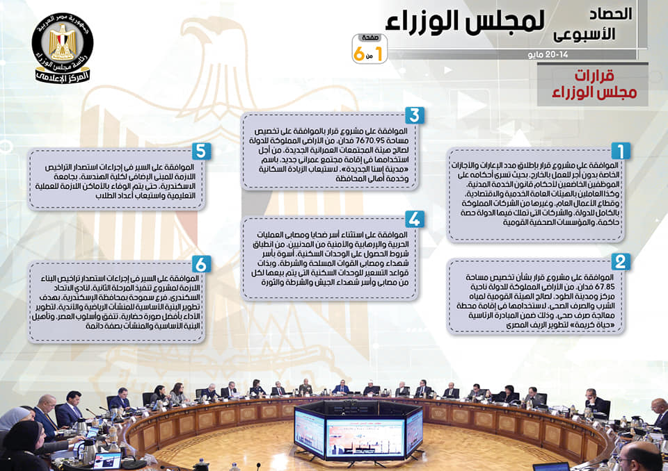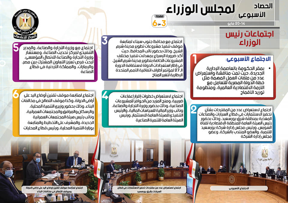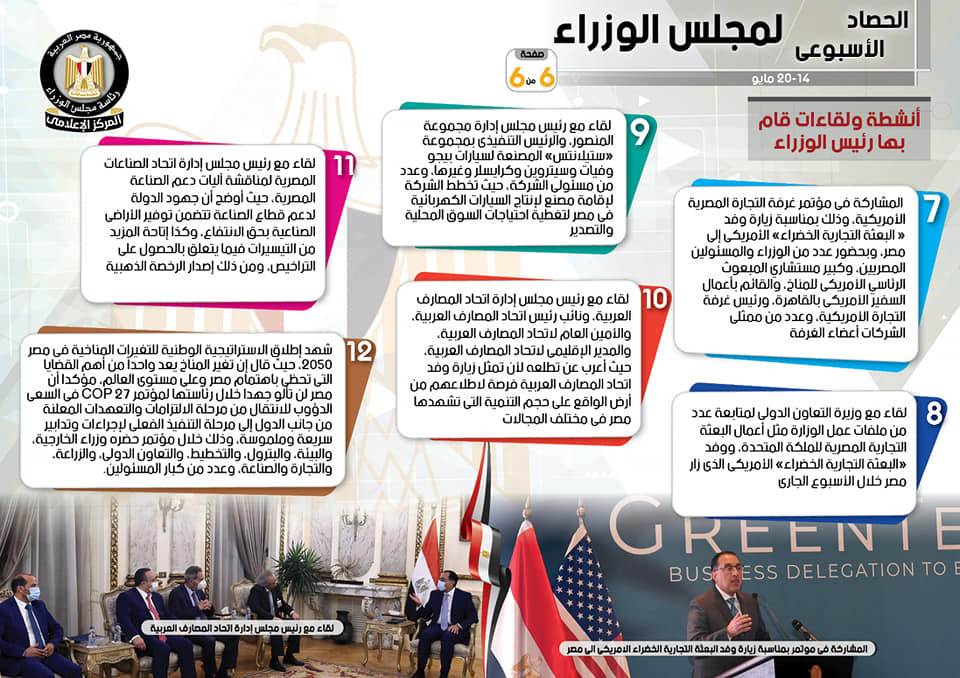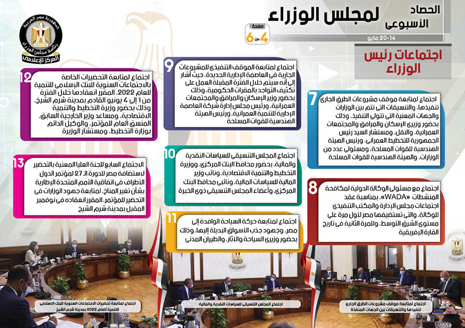 نشر المركز الإعلامي لمجلس الوزراء، تقريراً شمل إنفوجرافات سلط من خلالها الضوء على الحصاد الأسبوعي لمجلس الوزراء، وذلك خلال الفترة من 14 حتى 20 مايو 2022، والذي تضمن الموافقة على عدد من القرارات، فضلاً عن الاجتماعات واللقاءات التي عقدها الدكتور مصطفى مدبولي، رئيس مجلس الوزراء، بالإضافة إلى ما قام به سيادته من أنشطة.