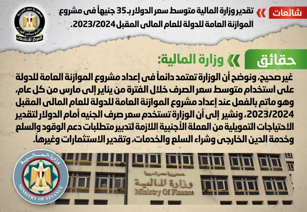 نفى المركز الإعلامي لمجلس الوزراء صحة ما انتشر من أنباء بشأن تقدير وزارة المالية متوسط سعر الدولار بـ٣٥ جنيهًا في مشروع الموازنة العامة للدولة للعام المالي المقبل ٢٠٢٣/٢٠٢٤.