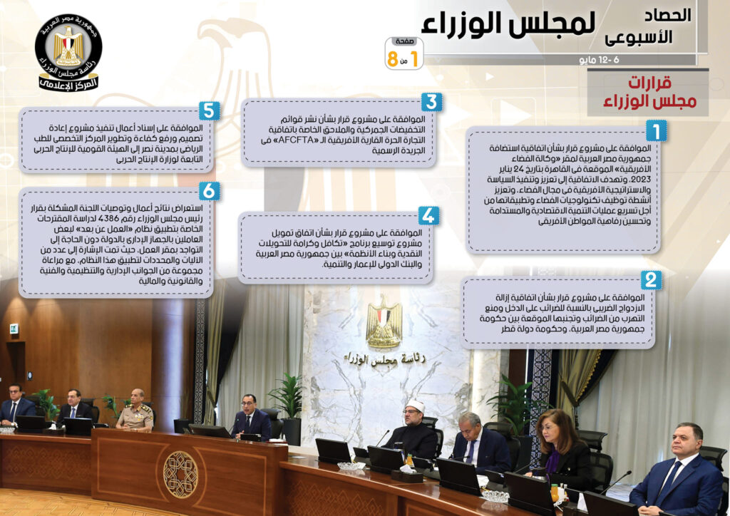وجاء في التقرير أنه تم إصدار عدد من القرارات وتشمل الموافقة على مشروع قرار بشأن اتفاقية استضافة جمهورية مصر العربية لمقر “وكالة الفضاء الأفريقية” الموقعة في القاهرة بتاريخ 24 يناير 2023، وتهدف الاتفاقية إلى تعزيز وتنفيذ السياسة والاستراتيجية الأفريقية في مجال الفضاء، وتعزيز أنشطة توظيف تكنولوجيات الفضاء وتطبيقاتها من أجل تسريع عمليات التنمية الاقتصادية والمستدامة وتحسين رفاهية المواطن الأفريقي، فضلاً عن الموافقة على مشروع قرار بشأن اتفاقية إزالة الازدواج الضريبي بالنسبة للضرائب على الدخل ومنع التهرب من الضرائب وتجنبها الموقعة بين حكومة جمهورية مصر العربية، وحكومة دولة قطر، بالإضافة إلى الموافقة على مشروع قرار بشأن نشر قوائم التخفيضات الجمركية والملاحق الخاصة باتفاقية التجارة الحرة القارية الأفريقية الـ “AFCFTA” فى الجريدة الرسمية، كما تمت الموافقة على مشروع قرار بشأن اتفاق تمويل مشروع توسيع برنامج “تكافل وكرامة للتحويلات النقدية وبناء الأنظمة” بين جمهورية مصر العربية والبنك الدولي للإعمار والتنمية، وكذلك الموافقة على إسناد أعمال تنفيذ مشروع إعادة تصميم ورفع كفاءة وتطوير المركز التخصصي للطب الرياضي بمدينة نصر إلى الهيئة القومية للإنتاج الحربي التابعة لوزارة الإنتاج الحربي، فيما تم استعراض نتائج أعمال وتوصيات اللجنة المشكلة بقرار رئيس مجلس الوزراء رقم 4386 لدراسة المقترحات الخاصة بتطبيق نظام “العمل عن بعد” لبعض العاملين بالجهاز الإداري بالدولة دون الحاجة إلى التواجد بمقر العمل، حيث تمت الإشارة إلى عدد من الآليات والمحددات لتطبيق هذا النظام، مع مراعاة مجموعة من الجوانب الإدارية والتنظيمية والفنية والقانونية والمالية.