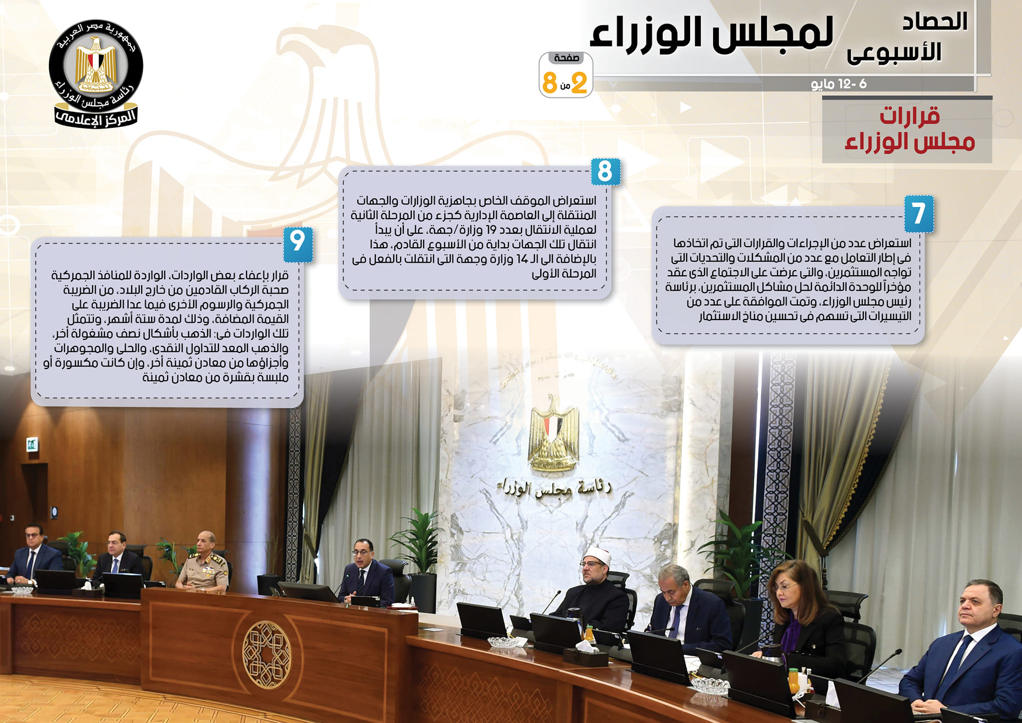 يأتي هذا إلى جانب استعراض عدد من الإجراءات والقرارات التي تم اتخاذها في إطار التعامل مع عدد من المشكلات والتحديات التي تواجه المستثمرين، والتي عرضت على الاجتماع الذي عقد مؤخراً للوحدة الدائمة لحل مشاكل المستثمرين، برئاسة رئيس مجلس الوزراء، وتمت الموافقة على عدد من التيسيرات التي تسهم في تحسين مناخ الاستثمار، فيما تم استعراض الموقف الخاص بجاهزية الوزارات والجهات المنتقلة إلى العاصمة الإدارية كجزء من المرحلة الثانية لعملية الانتقال بعدد 19 وزارة/جهة، على أن يبدأ انتقال تلك الجهات بداية من الأسبوع القادم، هذا بالإضافة إلى الـ 14 وزارة وجهة التي انتقلت بالفعل في المرحلة الأولى، بالإضافة إلى قرار بإعفاء بعض الواردات، الواردة للمنافذ الجمركية صحبة الركاب القادمين من خارج البلاد، من الضريبة الجمركية والرسوم الأخرى فيما عدا الضريبة على القيمة المضافة، وذلك لمدة ستة أشهر، وتتمثل تلك الواردات في: الذهب بأشكال نصف مشغولة أخر، والذهب المعد للتداول النقدي، والحلى والمجوهرات وأجزاؤها من معادن ثمينة أخر، وإن كانت مكسورة أو ملبسة بقشرة من معادن ثمينة.