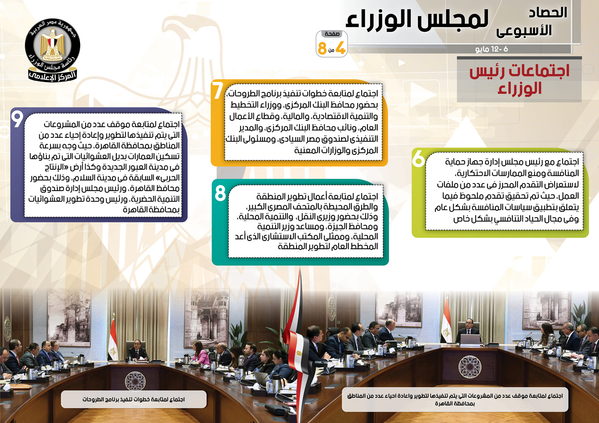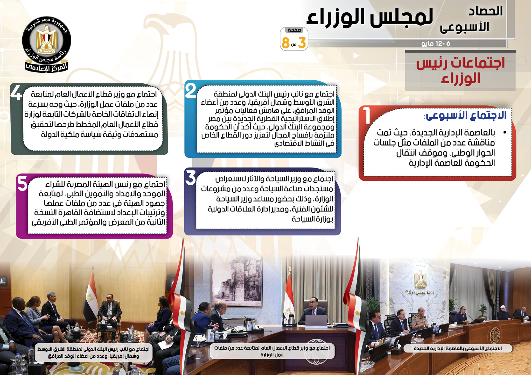 أما عن الاجتماعات التي عقدها رئيس مجلس الوزراء أورد التقرير، اجتماعاً مع نائب رئيس البنك الدولي لمنطقة الشرق الأوسط وشمال أفريقيا، وعدد من أعضاء الوفد المرافق، على هامش فعاليات مؤتمر إطلاق الاستراتيجية القطرية الجديدة بين مصر ومجموعة البنك الدولي، حيث أكد أن الحكومة ملتزمة بإفساح المجال لتعزيز دور القطاع الخاص في النشاط الاقتصادي، فضلاً عن اجتماع لمتابعة خطوات تنفيذ برنامج الطروحات، بحضور محافظ البنك المركزي، ووزراء التخطيط والتنمية الاقتصادية، والمالية، وقطاع الأعمال العام، ونائب محافظ البنك المركزي، والمدير التنفيذي لصندوق مصر السيادي، ومسئولي البنك المركزي والوزارات المعنية، وكذلك اجتماع لمتابعة موقف عدد من المشروعات التي يتم تنفيذها لتطوير وإعادة إحياء عدد من المناطق بمحافظة القاهرة، حيث وجه بسرعة تسكين العمارات بديل العشوائيات التي تم بناؤها في مدينة العبور الجديدة وكذا أرض “الإنتاج الحربي” السابقة في مدينة السلام، وذلك بحضور محافظ القاهرة، ورئيس مجلس إدارة صندوق التنمية الحضرية، ورئيس وحدة تطوير العشوائيات بمحافظة القاهرة، بالإضافة إلى اجتماع مع وزير قطاع الأعمال العام لمتابعة عدد من ملفات عمل الوزارة، حيث وجه بسرعة إنهاء الاتفاقات الخاصة بالشركات التابعة لوزارة قطاع الأعمال العام المخطط طرحها لتحقيق مستهدفات وثيقة سياسة ملكية الدولة، فيما تم عقد اجتماع مع رئيس مجلس إدارة جهاز حماية المنافسة ومنع الممارسات الاحتكارية، لاستعراض التقدم المحرز في عدد من ملفات العمل، حيث تم تحقيق تقدم ملحوظ فيما يتعلق بتطبيق سياسات المنافسة بشكل عام وفي مجال الحياد التنافسي بشكل خاص.
