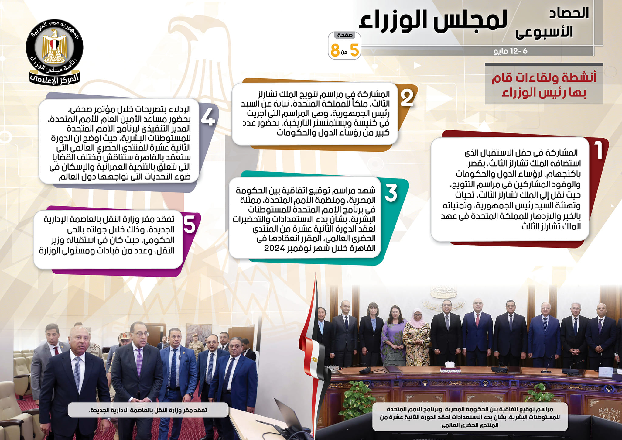 وبشأن الأنشطة التي قام بها رئيس مجلس الوزراء، فبحسب التقرير، فقد قام بالمشاركة في حفل الاستقبال الذي استضافه الملك تشارلز الثالث، بقصر باكنجهام، لرؤساء الدول والحكومات والوفود المشاركين في مراسم التتويج، حيث نقل إلى الملك تشارلز الثالث، تحيات وتهنئة السيد رئيس الجمهورية، وتمنياته بالخير والازدهار للمملكة المتحدة فى عهد الملك تشارلز الثالث، فضلاً عن المشاركة في مراسم تتويج الملك تشارلز الثالث، ملكاً للمملكة المتحدة، نيابة عن السيد رئيس الجمهورية، وهي المراسم التي أجريت في كنيسة ويستمنستر التاريخية، بحضور عدد كبير من رؤساء الدول والحكومات، كما شهد مراسم توقيع اتفاقية بين الحكومة المصرية، ومنظمة الأمم المتحدة، ممثلة في برنامج الأمم المتحدة للمستوطنات البشرية، بشأن بدء الاستعدادات والتحضيرات لعقد الدورة الثانية عشرة من المنتدى الحضري العالمي، المقرر انعقادها في القاهرة خلال شهر نوفمبر 2024، إلى جانب الإدلاء بتصريحات خلال مؤتمر صحفي، بحضور مساعد الأمين العام للأمم المتحدة، المدير التنفيذي لبرنامج الأمم المتحدة للمستوطنات البشرية، حيث أوضح أن الدورة الثانية عشرة للمنتدى الحضري العالمى التي ستعقد بالقاهرة ستناقش مختلف القضايا التي تتعلق بالتنمية العمرانية والإسكان في ضوء التحديات التي تواجهها دول العالم، فيما شهد ونائب الرئيس الإقليمي لمجموعة البنك الدولي لشئون منطقة الشرق الأوسط وشمال أفريقيا، فعاليات مؤتمر إطلاق الاستراتيجية القطرية الجديدة بين مصر ومجموعة البنك الدولي للفترة من 2023-2027، وذلك بحضور عدد من الوزراء، ومسئولي الجهات والهيئات المعنية، وكذا ممثلي ومسئولي مجموعة البنك الدولي.