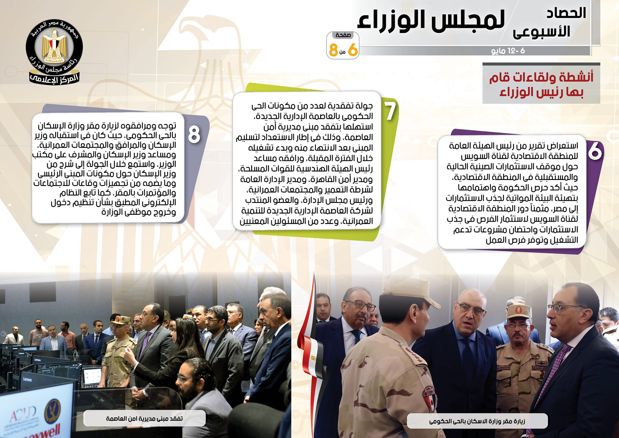 كما تضمنت الأنشطة أيضاً كما ذكر التقرير، استعراض تقرير من رئيس الهيئة العامة للمنطقة الاقتصادية لقناة السويس حول موقف الاستثمارات الصينية الحالية والمستقبلية في المنطقة الاقتصادية، حيث أكد حرص الحكومة واهتمامها بتهيئة البيئة المواتية لجذب الاستثمارات إلى مصر، مثمناً دور المنطقة الاقتصادية لقناة السويس لاستثمار الفرص في جذب الاستثمارات واحتضان مشروعات تدعم التشغيل وتوفر فرص العمل، إلى جانب جولة تفقدية لعدد من مكونات الحي الحكومي بالعاصمة الإدارية الجديدة، استهلها بتفقد مبنى مديرية أمن العاصمة، وذلك في إطار الاستعداد لتسليم المبنى بعد الانتهاء منه وبدء تشغيله خلال الفترة المقبلة، ورافقه مساعد رئيس الهيئة الهندسية للقوات المسلحة، ومدير أمن القاهرة، ومدير الإدارة العامة لشرطة التعمير والمجتمعات العمرانية، ورئيس مجلس الإدارة، والعضو المنتدب لشركة العاصمة الإدارية الجديدة للتنمية العمرانية، وعدد من المسئولين المعنيين، في حين توجه ومرافقوه لزيارة مقر وزارة الإسكان بالحي الحكومي، حيث كان في استقباله وزير الإسكان والمرافق والمجتمعات العمرانية، ومساعد وزير الإسكان والمشرف على مكتب الوزير، واستمع خلال الجولة إلى شرح من وزير الإسكان حول مكونات المبنى الرئيسي وما يضمه من تجهيزات وقاعات للاجتماعات والمؤتمرات بالمقر، كما تابع النظام الإلكتروني المطبق بشأن تنظيم دخول وخروج موظفي الوزارة، وكذلك تفقد سيادته مقر وزارة النقل بالعاصمة الإدارية الجديدة، وذلك خلال جولته بالحي الحكومي، حيث كان في استقباله وزير النقل، وعدد من قيادات ومسئولي الوزارة.