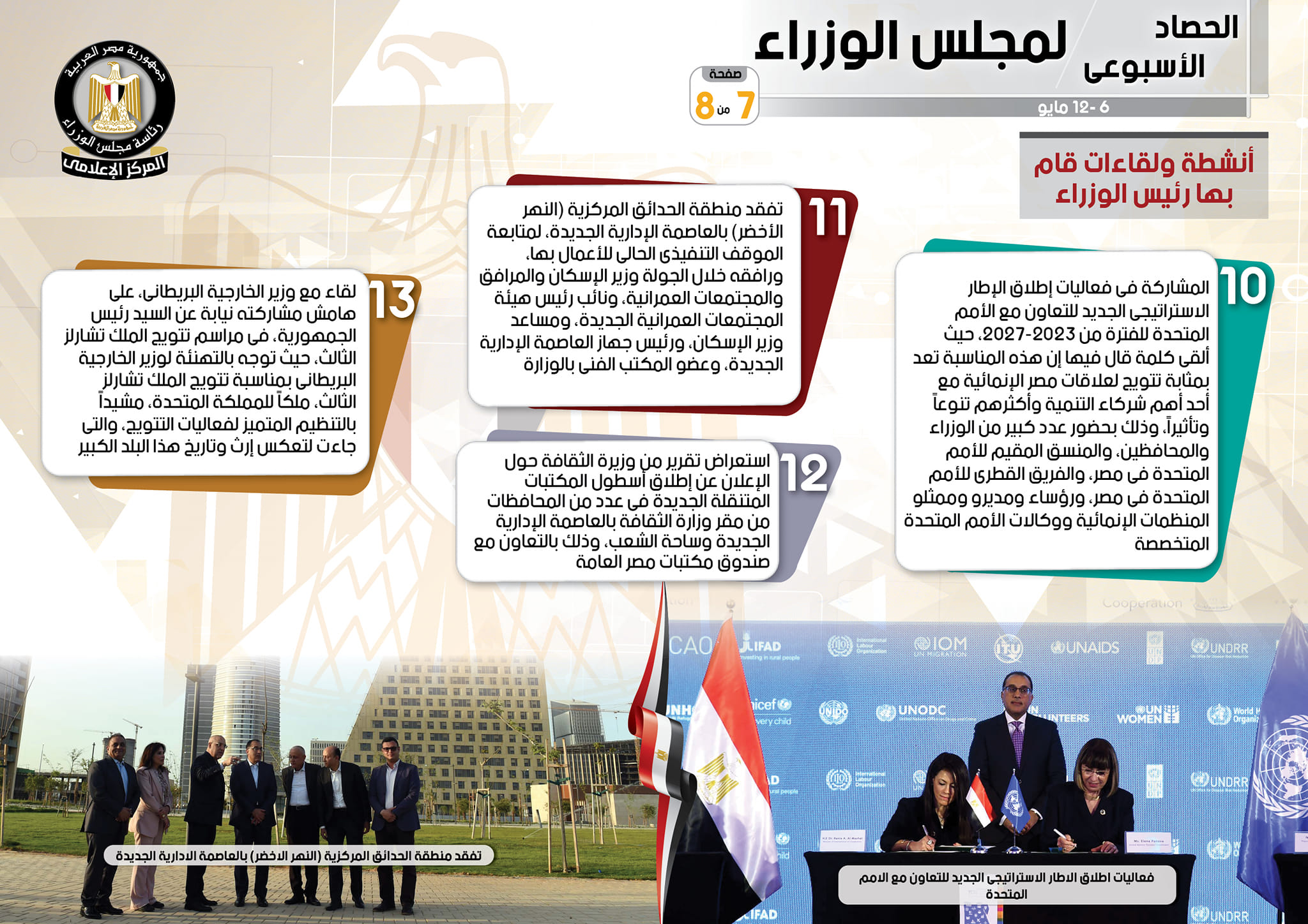 واستكمالاً لأنشطة رئيس مجلس الوزراء، أشار التقرير إلى مشاركة سيادته في فعاليات إطلاق الإطار الاستراتيجي الجديد للتعاون مع الأمم المتحدة للفترة من 2023-2027، حيث ألقى كلمة قال فيها إن هذه المناسبة تعد بمثابة تتويج لعلاقات مصر الإنمائية مع أحد أهم شركاء التنمية وأكثرهم تنوعًا وتأثيراً، وذلك بحضور عدد كبير من الوزراء والمحافظين، والمنسق المقيم للأمم المتحدة في مصر، والفريق القطري للأمم المتحدة في مصر، ورؤساء ومديرو وممثلو المنظمات الإنمائية ووكالات الأمم المتحدة المتخصصة، كما تفقد منطقة الحدائق المركزية (النهر الأخضر) بالعاصمة الإدارية الجديدة، لمتابعة الموقف التنفيذي الحالي للأعمال بها، ورافقه خلال الجولة وزير الإسكان والمرافق والمجتمعات العمرانية، ونائب رئيس هيئة المجتمعات العمرانية الجديدة، ومساعد وزير الإسكان، ورئيس جهاز العاصمة الإدارية الجديدة، وعضو المكتب الفني بالوزارة، فيما تم استعراض تقرير من وزيرة الثقافة حول الإعلان عن إطلاق أسطول المكتبات المتنقلة الجديدة فى عدد من المحافظات من مقر وزارة الثقافة بالعاصمة الإدارية الجديدة وساحة الشعب، وذلك بالتعاون مع صندوق مكتبات مصر العامة.