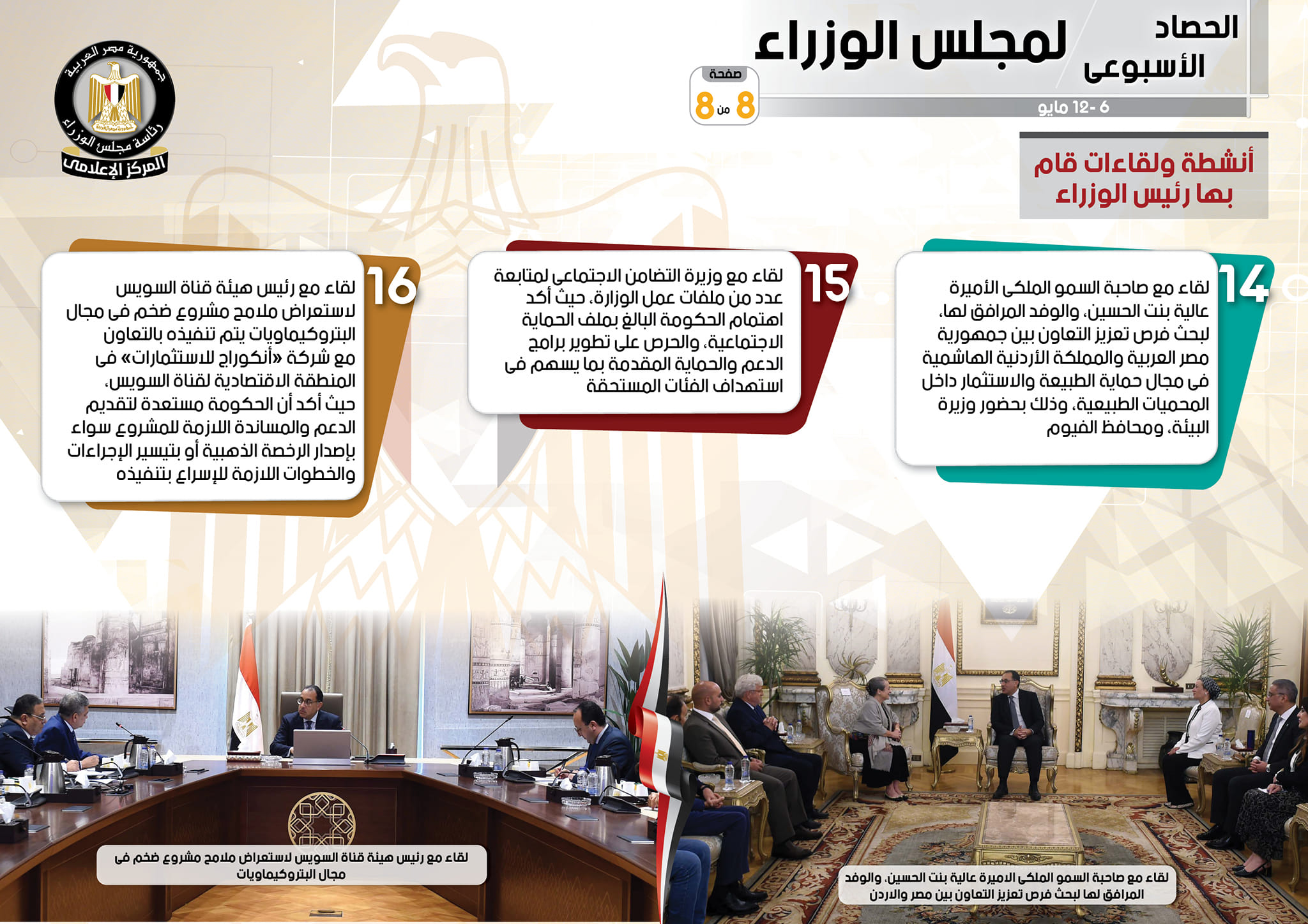 أما عن اللقاءات التي عقدها رئيس مجلس الوزراء على مدار الأسبوع، نوه التقرير إلى لقاء مع وزير الخارجية البريطاني، على هامش مشاركته نيابة عن السيد رئيس الجمهورية، في مراسم تتويج الملك تشارلز الثالث، حيث توجه بالتهنئة لوزير الخارجية البريطاني بمناسبة تتويج الملك تشارلز الثالث، ملكاً للمملكة المتحدة، مشيداً بالتنظيم المتميز لفعاليات التتويج، والتي جاءت لتعكس إرث وتاريخ هذا البلد الكبير، بالإضافة إلى لقاء مع صاحبة السمو الملكي الأميرة عالية بنت الحسين، والوفد المرافق لها، لبحث فرص تعزيز التعاون بين جمهورية مصر العربية والمملكة الأردنية الهاشمية في مجال حماية الطبيعة والاستثمار داخل المحميات الطبيعية، وذلك بحضور وزيرة البيئة، ومحافظ الفيوم، فضلاً عن لقاء مع وزيرة التضامن الاجتماعي لمتابعة عدد من ملفات عمل الوزارة، حيث أكد اهتمام الحكومة البالغ بملف الحماية الاجتماعية، والحرص على تطوير برامج الدعم والحماية المقدمة بما يسهم في استهداف الفئات المستحقة، وكذلك لقاء مع رئيس هيئة قناة السويس لاستعراض ملامح مشروع ضخم في مجال البتروكيماويات يتم تنفيذه بالتعاون مع شركة “أنكوراج للاستثمارات” في المنطقة الاقتصادية لقناة السويس، حيث أكد أن الحكومة مستعدة لتقديم الدعم والمساندة اللازمة للمشروع سواء بإصدار الرخصة الذهبية أو بتيسير الإجراءات والخطوات اللازمة للإسراع بتنفيذه.
