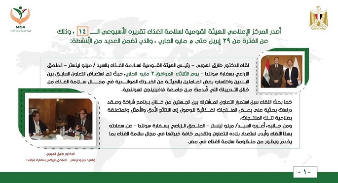 لقاء الدكتور طارق الهوبي – رئيس الهيئة القومية لسلامة الغذاء – بالسيد / ميلو لينستر – الملحق الزراعي بسفارة هولندا – يوم الثلاثاء الموافق 2 مايو الجاري، حيث تم استعراض التعاون السابق بين البلدين، واكتساب بعض العاملين بالهيئة من الخبرات الهولندية في مجال سلامة الغذاء من خلال التدريبات التي قُدمت من جامعة فاخينينجن الهولندية.