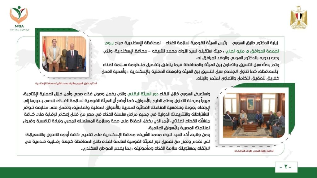 ومن جانبه، أكد السيد اللواء محمد الشريف محافظ الإسكندرية على تقديم كافة أوجه التعاون والتسهيلات التي تخدم وتعزز من تفعيل دور الهيئة القومية لسلامة الغذاء داخل المحافظة كجهة رقابية خدمية في الارتقاء بمستويات سلامة الغذاء ومأمونيته ، بما يخدم المواطن السكندري.