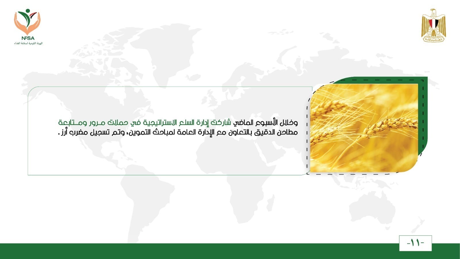 وخلال الأسبوع الماضي شاركت إدارة السلع الاستراتيجية في حملات مرور ومتابعة مطاحن الدقيق بالتعاون مع الإدارة العامة لمباحث التموين، وتم تسجيل مضرب أرز.