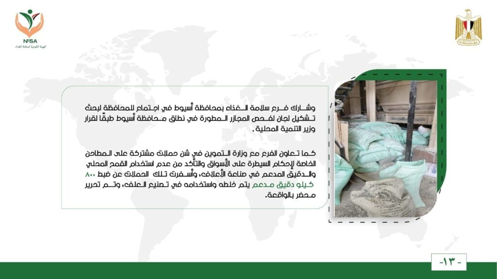 كما تعاون الفرع مع وزارة التموين في شن حملات مشتركة على المطاحن الخاصة لإحكام السيطرة على الأسواق والتأكد من عدم استخدام القمح المحلي والدقيق المدعم في صناعة الأعلاف، وأسفرت تلك الحملات عن ضبط 800 كيلو دقيق مدعم يتم خلطه واستخدامه في تصنيع العلف، وتم تحرير محضر بالواقعة.