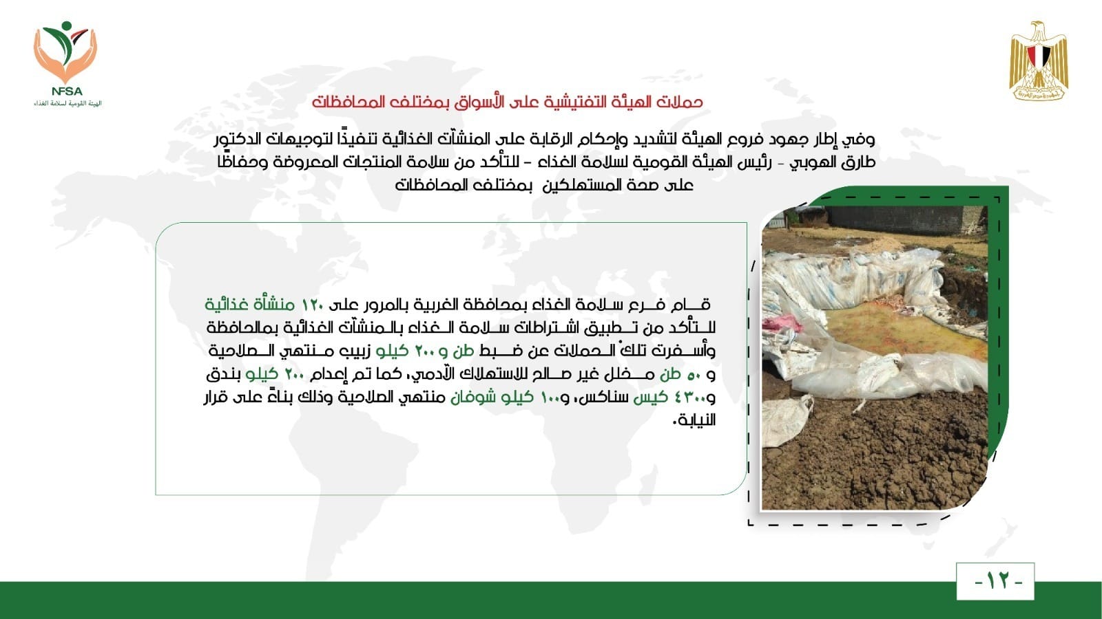 وفي إطار جهود فروع الهيئة لتشديد وإحكام الرقابة على المنشآت الغذائية تنفيذًا لتوجيهات الدكتور طارق الهوبي – رئيس الهيئة القومية لسلامة الغذاء – للتأكد من سلامة المنتجات المعروضة وحفاظًا على صحة المستهلكين بمختلف المحافظات ،،