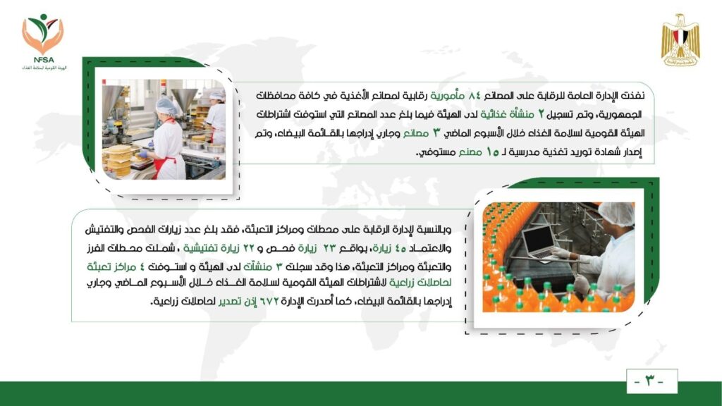 نفذت الإدارة العامة للرقابة على المصانع 84 مأمورية رقابية لمصانع الأغذية في كافة محافظات الجمهورية، وتم تسجيل 2 منشأة غذائية لدى الهيئة فيما بلغ عدد المصانع التي استوفت اشتراطات الهيئة القومية لسلامة الغذاء خلال الأسبوع الماضي 3 مصانع وجاري إدراجها بالقائمة البيضاء، وتم إصدار شهادة توريد تغذية مدرسية لـ 15 مصنع مستوفي.