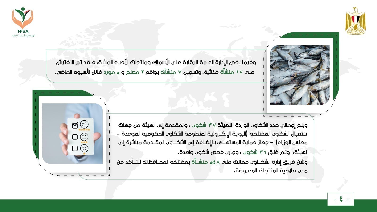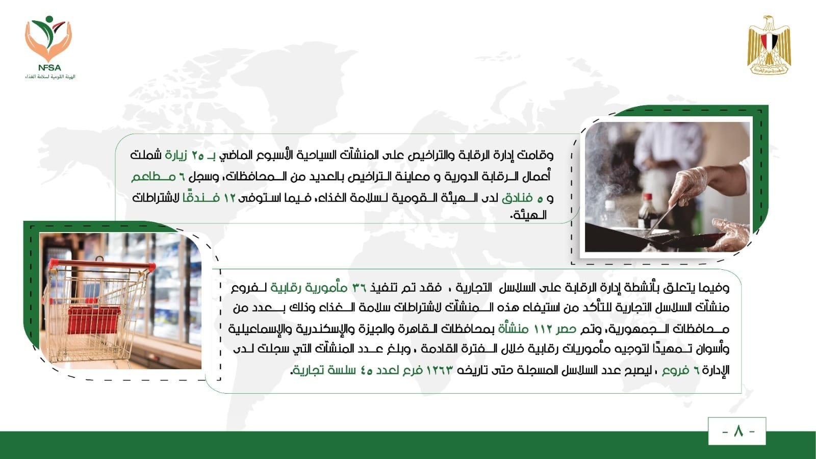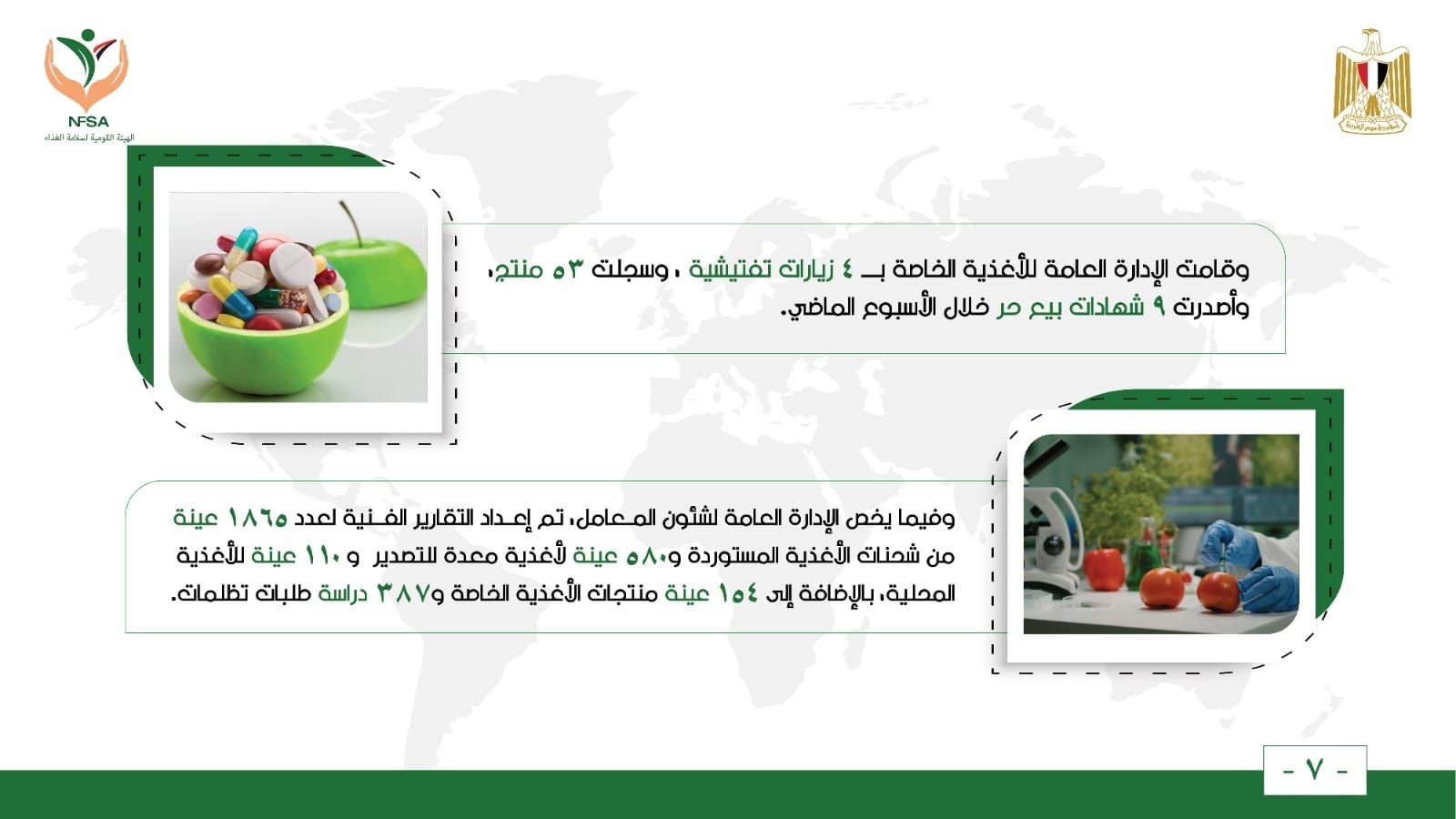 وقامت الإدارة العامة للأغذية الخاصة بـ 4 زيارات تفتيشية ، وسجلت 53 منتج ، وأصدرت 9 شهادات بيع حر خلال الأسبوع الماضي.