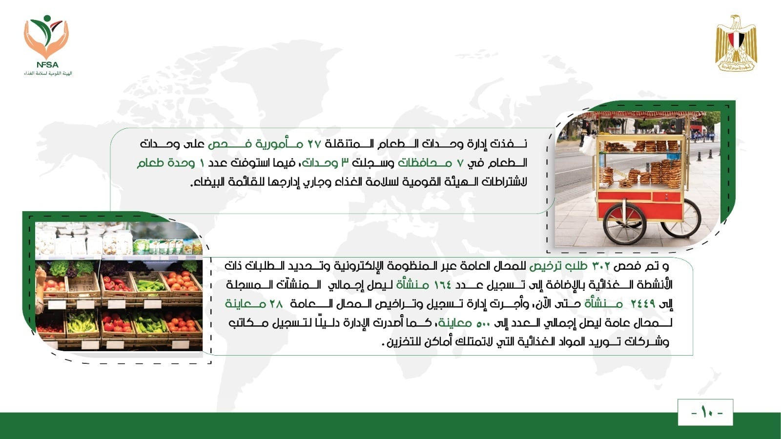 وبالنسبة لإدارة الرقابة على محطات ومراكز التعبئة، فقد بلغ عدد زيارات الفحص والتفتيش والاعتماد 45 زيارة، بواقع 23 زيارة فحص و 22 زيارة تفتيشية ، شملت محطات الفرز والتعبئة ومراكز التعبئة، هذا وقد سجلت 3 منشآت لدى الهيئة و استوفت 4 مراكز تعبئة لحاصلات زراعية لاشتراطات الهيئة القومية لسلامة الغذاء خلال الأسبوع الماضي وجاري إدراجها بالقائمة البيضاء، كما أصدرت الإدارة 672 إذن تصدير لحاصلات زراعية.