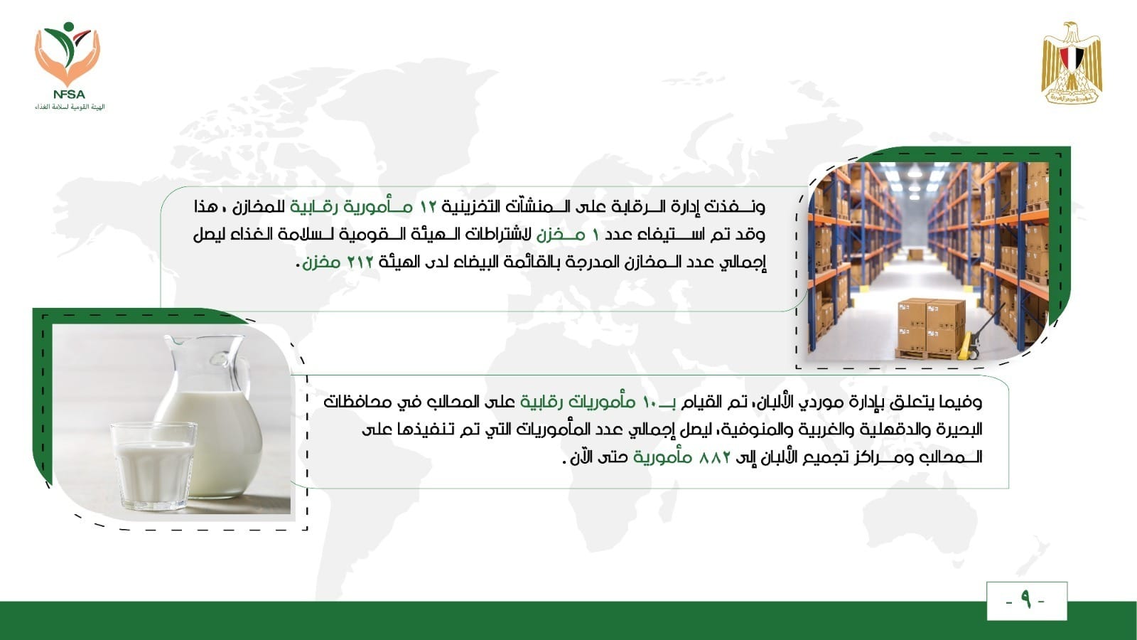 وفيما يتعلق بإدارة موردي الألبان، تم القيام بــــ 10 مأموريات رقابية على المحالب في محافظات البحيرة، والدقهلية والغربية والمنوفية، ليصل إجمالي عدد المأموريات التي تم تنفيذها على المحالب ومراكز تجميع الألبان إلى 882 مأمورية حتى الآن.