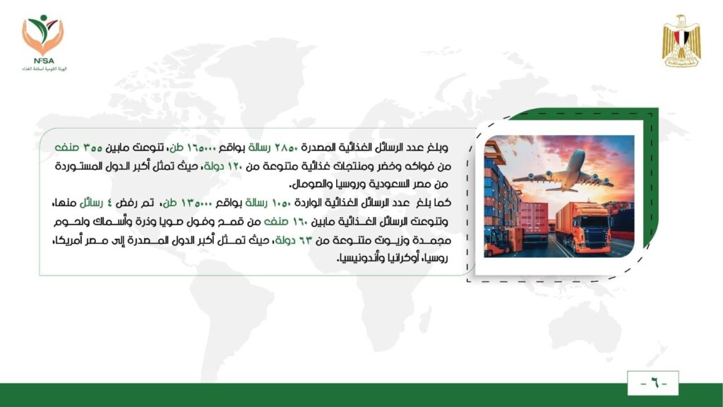 وبلغ عدد الرسائل الغذائية المصدرة 2850 رسالة بواقع 165000 طن، تنوعت مابين 355 صنف من فواكه وخضر ومنتجات غذائية متنوعة من 120 دولة، حيث تمثل أكبر الدول المستوردة من مصر السعودية وروسيا والصومال.