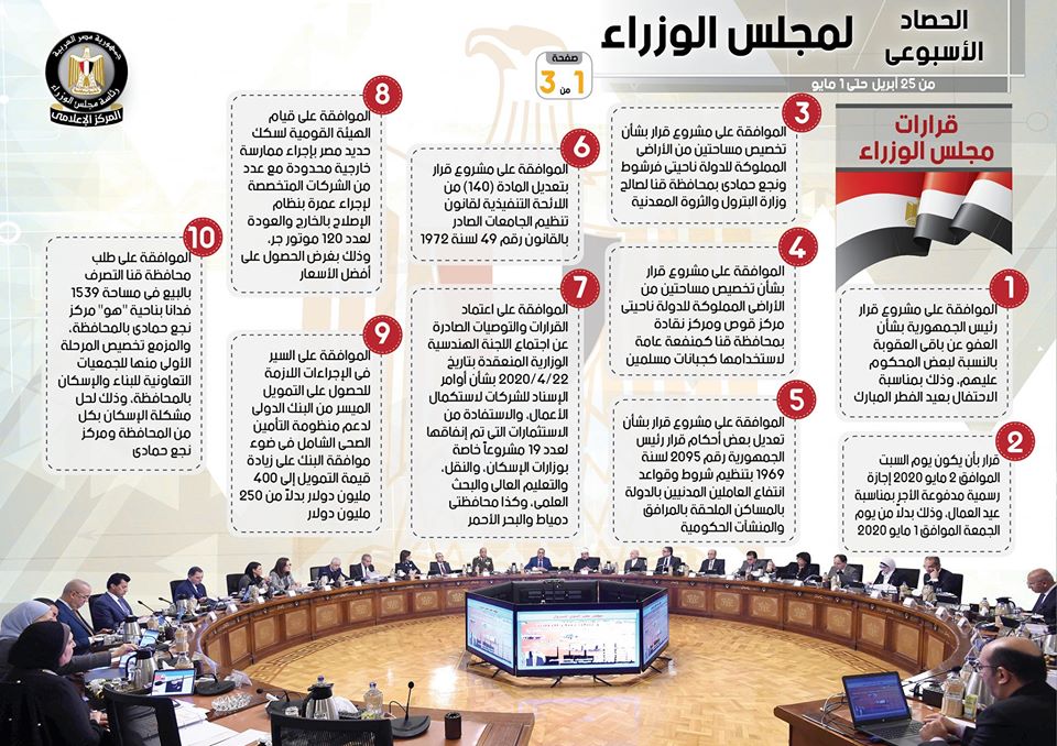 وجاء في الإنفوجراف، أنه تمت الموافقة على عدد من القرارات، تشمل قرار بأن يكون يوم السبت الموافق 2 مايو 2020 إجازة رسمية مدفوعة الأجر بمناسبة عيد العمال، وذلك بدلاً من يوم الجمعة الموافق 1 مايو 2020، فضلاً عن الموافقة على مشروع قرار بشأن تخصيص مساحتين من الأراضي المملوكة للدولة ناحيتي فرشوط ونجع حمادي بمحافظة قنا لصالح وزارة البترول والثروة المعدنية، وكذلك الموافقة على مشروع قرار بشأن تخصيص مساحتين من الأراضي المملوكة للدولة ناحيتي مركز قوص ومركز نقادة بمحافظة قنا كمنفعة عامة لاستخدامها كجبانات مسلمين، هذا بجانب موافقة سيادته على مشروع قرار بشأن تعديل بعض أحكام قرار رئيس الجمهورية رقم 2095 لسنة 1969 بتنظيم شروط وقواعد انتفاع العاملين المدنيين بالدولة بالمساكن المُلحقة بالمرافق والمنشآت الحكومية.