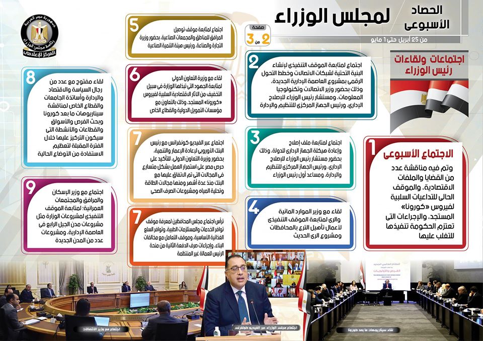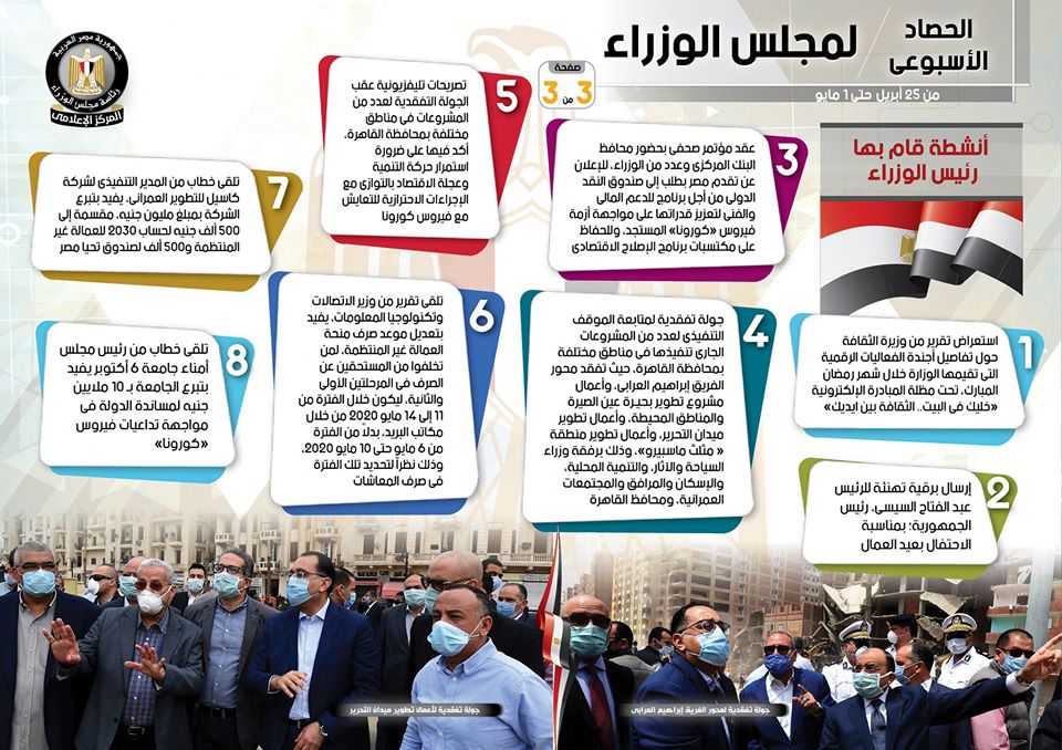 وبشأن الأنشطة التي قام بها رئيس مجلس الوزراء، فبحسب الإنفوجراف، شملت استعراض تقرير من وزيرة الثقافة حول تفاصيل أجندة الفعاليات الرقمية التي تقيمها الوزارة خلال شهر رمضان المبارك، تحت مظلة المبادرة الإلكترونية “خليك في البيت.. الثقافة بين ايديك”، فضلاً عن عقد مؤتمر صحفي بحضور محافظ البنك المركزي وعدد من الوزراء، للإعلان عن تقدم مصر بطلب إلى صندوق النقد الدولي من أجل برنامج للدعم المالي والفني لتعزيز قدراتها على مواجهة أزمة فيروس “كورونا” المستجد، وللحفاظ على مكتسبات برنامج الإصلاح الاقتصادي، هذا بجانب قيام سيادته بجولة تفقدية لمتابعة الموقف التنفيذي لعدد من المشروعات الجاري تنفيذها في مناطق مختلفة بمحافظة القاهرة، حيث تفقد محور الفريق إبراهيم العرابي، وكذلك تفقد أعمال مشروع تطوير بحيـرة عين الصيرة والمناطق المحيطة، وأعمال تطوير ميدان التحرير، وأعمال تطوير منطقة “مثلث ماسبيرو”، وذلك برفقة وزراء السياحة والآثار، والتنمية المحلية، والإسكان والمرافق والمجتمعات العمرانية، ومحافظ القاهرة.
