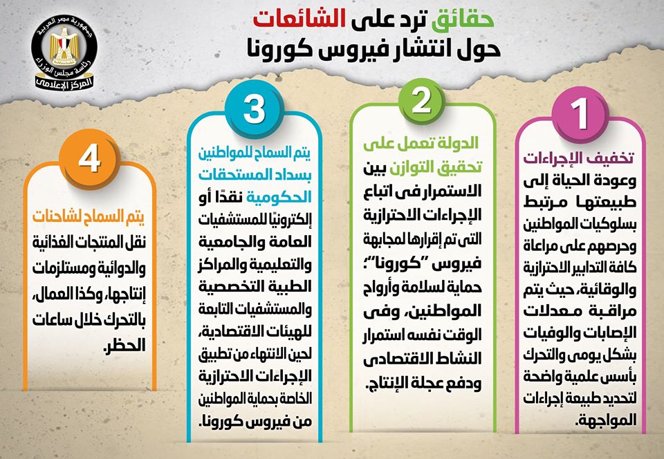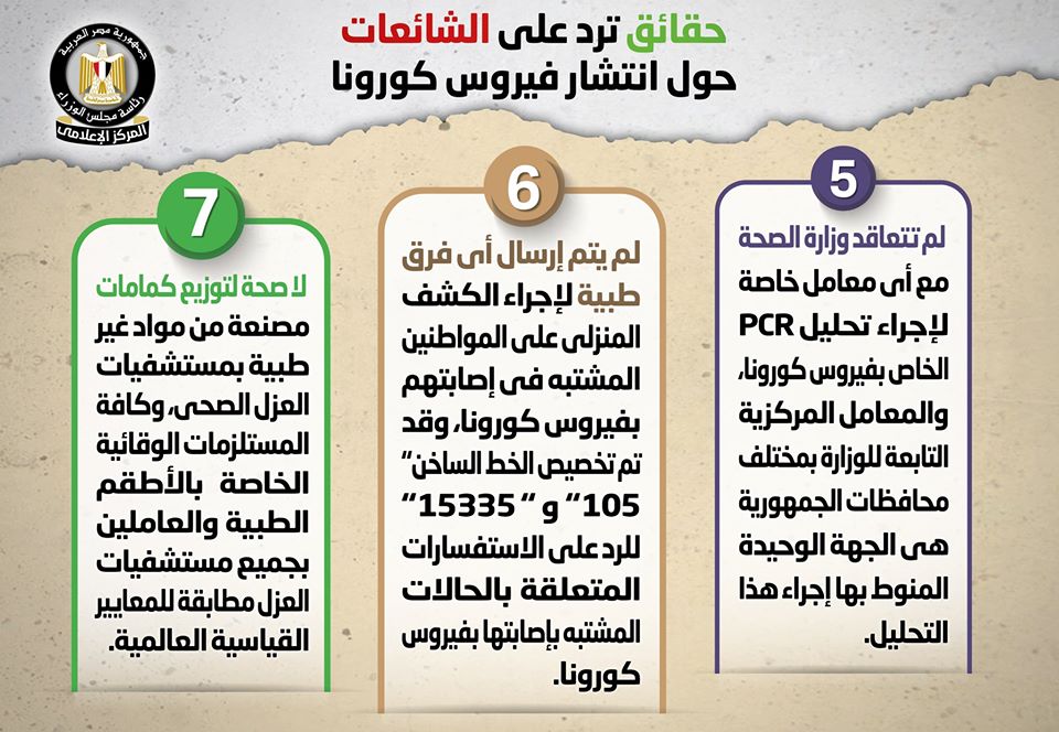 أوضح المركز الإعلامي لمجلس الوزراء، اليوم الجمعة، عددا من الحقائق حول فيروس كورونا.مفندا في الوقت نفسه بعض الشائعات حول الفيروس.