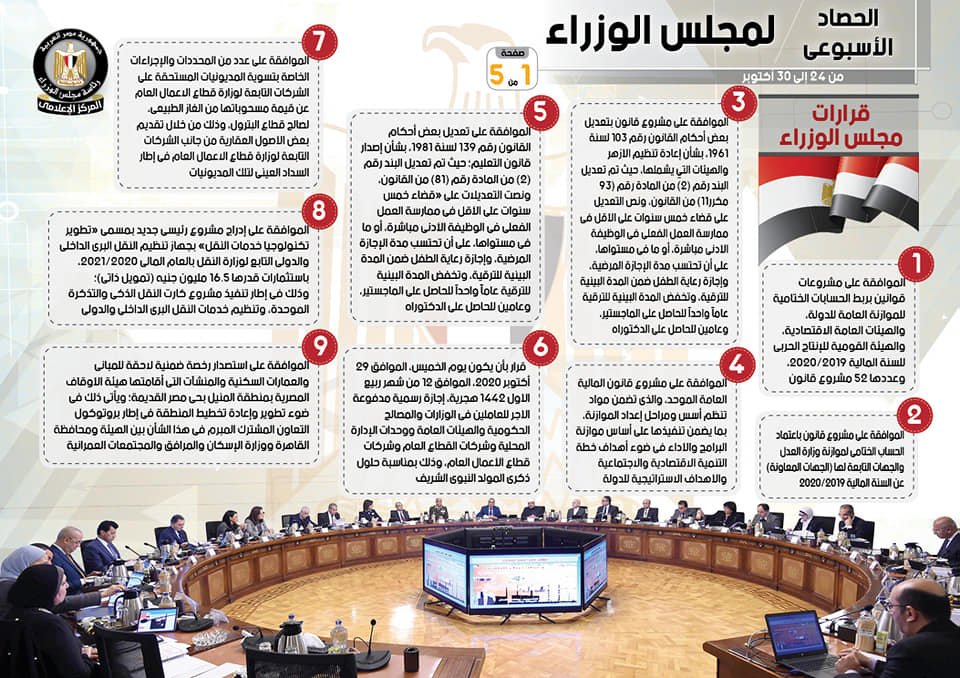 وجاء في التقرير أنه تم إصدار عدد من القرارات، تشمل قراراً بأن يكون يوم الخميس الموافق 29 أكتوبر 2020، الموافق 12 من شهر ربيع الأول 1442 هجرية، إجازة رسمية مدفوعة الأجر للعاملين في الوزارات والمصالح الحكومية والهيئات العامة ووحدات الإدارة المحلية وشركات القطاع العام وشركات قطاع الأعمال العام، وذلك بمناسبة حلول ذكرى المولد النبوي الشريف، وكذلك الموافقة على مشروعات قوانين بربط الحسابات الختامية للموازنة العامة للدولة، والهيئات العامة الاقتصادية، والهيئة القومية للإنتاج الحربى للسنة المالية 2019/2020، وعددها 52 مشروع قانون، فضلاً عن الموافقة على مشروع قانون باعتماد الحساب الختامي لموازنة وزارة العدل والجهات التابعة لها (الجهات المعاونة) عن السنة المالية 2019/2020.