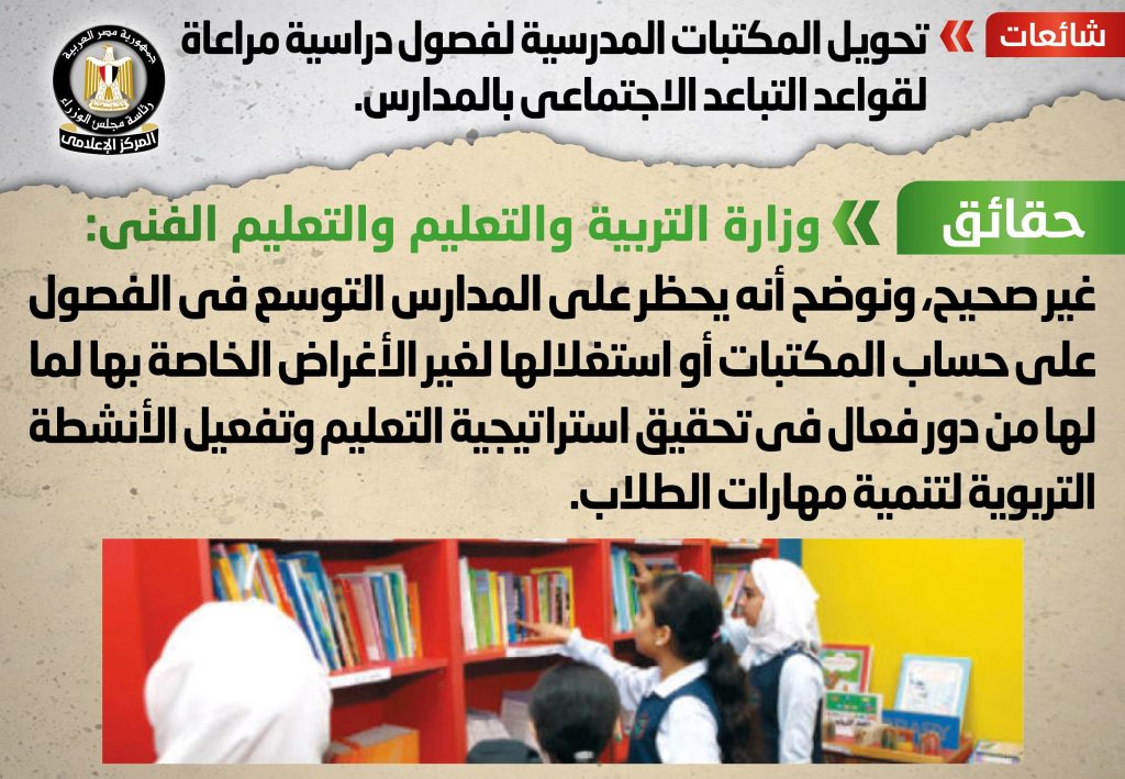 تداولت بعض المواقع الإلكترونية وصفحات التواصل الاجتماعي أنباء بشأن تحويل المكتبات المدرسية لفصول دراسية مراعاة لقواعد التباعد الاجتماعي بالمدارس، وقد قام المركز الإعلامي لمجلس الوزراء بالتواصل مع وزارة التربية والتعليم والتعليم الفني، والتي نفت تلك الأنباء، مُؤكدةً أنه لا صحة لتحويل أي من المكتبات المدرسية لفصول دراسية، ولم يتم إصدار أي قرارات أو تعليمات بهذا الشأن، مُوضحةً أنه يحظر على المدارس التوسع في الفصول على حساب المكتبات أو استغلالها لغير الأغراض الخاصة بها، لما لها من دور فعال في تحقيق استراتيجية التعليم وتفعيل الأنشطة التربوية لتنمية مهارات الطلاب.