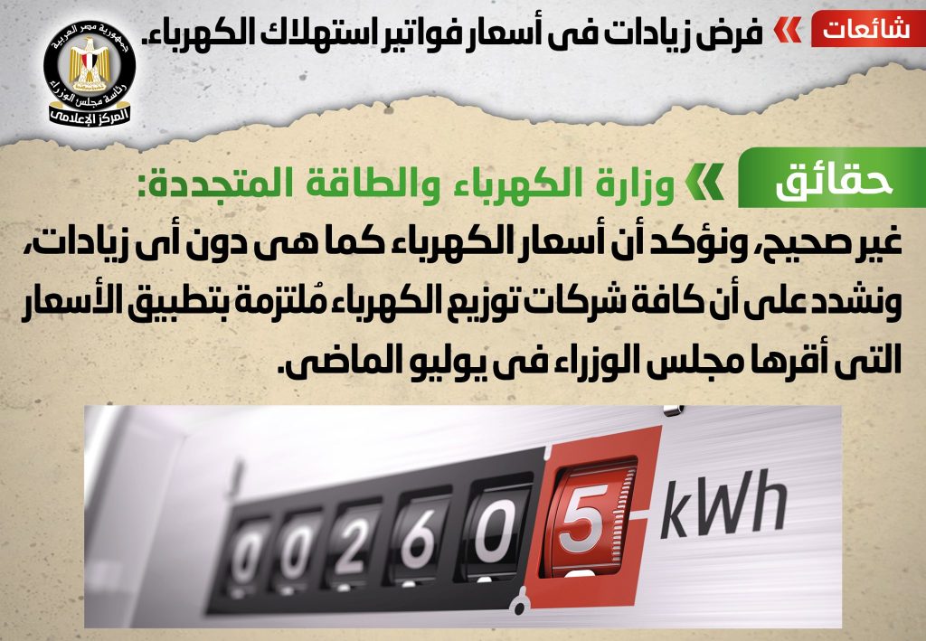 تردد في بعض وسائل الإعلام والمواقع الإلكترونية وصفحات التواصل الاجتماعي أنباء بشأن فرض زيادات في أسعار فواتير استهلاك الكهرباء، وقد قام المركز الإعلامي لمجلس الوزراء بالتواصل مع وزارة الكهرباء والطاقة المتجددة، والتي نفت تلك الأنباء، مُؤكدةً أنه لا صحة لفرض أي زيادات في أسعار فواتير استهلاك الكهرباء، وأن أسعار الكهرباء كما هي دون أي زيادات، مُوضحةً أن كافة شركات توزيع الكهرباء مُلتزمة بتطبيق الأسعار التي أقرها مجلس الوزراء في يوليو الماضي.