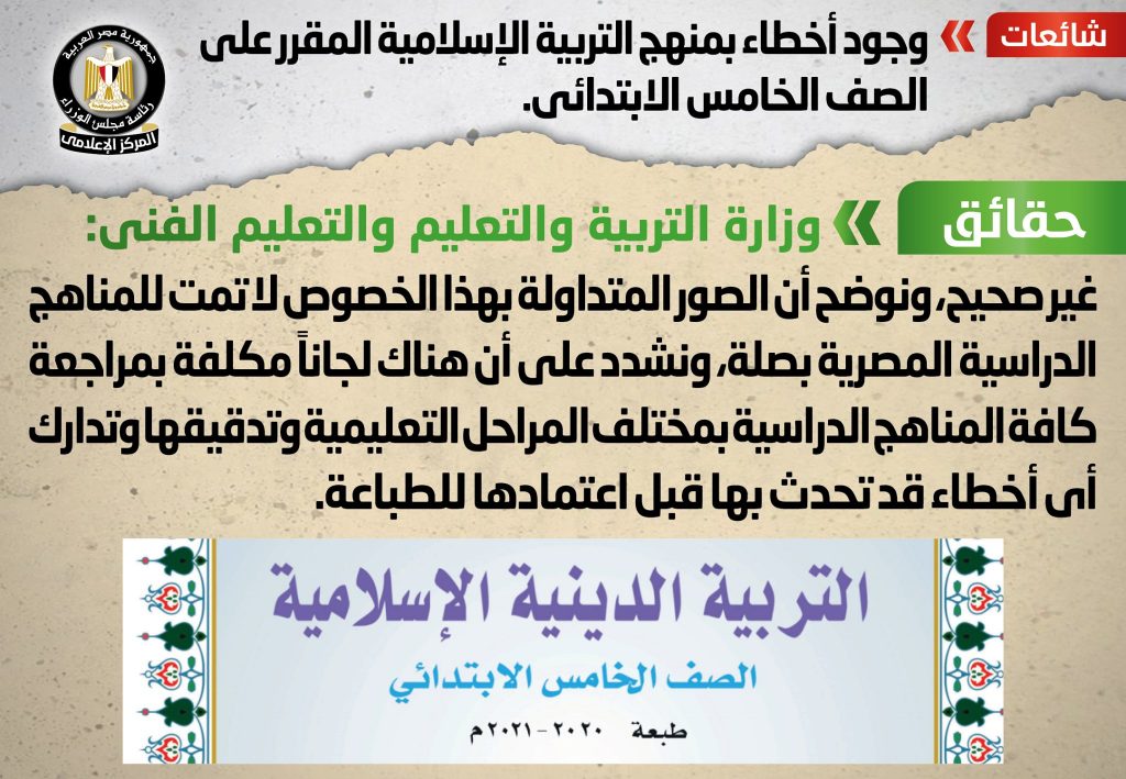 تداولت بعض المواقع الإلكترونية وصفحات التواصل الاجتماعي صوراً بشأن وجود أخطاء بمنهج التربية الإسلامية المقرر على الصف الخامس الابتدائي، وقد قام المركز الإعلامي لمجلس الوزراء بالتواصل مع وزارة التربية والتعليم والتعليم الفني، والتي نفت تلك الأنباء، مُؤكدةً أنه لا صحة لوجود أخطاء سواء بمنهج التربية الإسلامية أو أي مناهج دراسية أخرى، وأن الصور المتداولة بهذا الخصوص لا تمت للمناهج الدراسية المصرية بصلة، مُشددةً على أن هناك لجاناً مكلفة بمراجعة كافة المناهج الدراسية بمختلف المراحل التعليمية وتدقيقها وتدارك أي أخطاء قد تحدث بها قبل اعتمادها للطباعة.