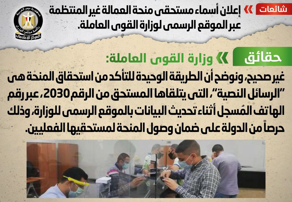 تداولت بعض المواقع الإلكترونية وصفحات التواصل الاجتماعي أنباء بشأن إعلان أسماء مستحقي منحة العمالة غير المنتظمة عبر الموقع الرسمي لوزارة القوى العاملة، وقد قام المركز الإعلامي لمجلس الوزراء بالتواصل مع وزارة القوى العاملة، والتي نفت تلك الأنباء، مُؤكدةً أنه لا صحة لإعلان أسماء مستحقي منحة العمالة غير المنتظمة عبر الموقع الرسمي لوزارة القوى العاملة، مُوضحةً أن الطريقة الوحيدة للتأكد من استحقاق المنحة هي “الرسائل النصية”، التي يتلقاها المستحق من الرقم 2030، عبر رقم الهاتف المُسجل أثناء تحديث البيانات بالموقع الرسمي للوزارة، وذلك حرصاً من الدولة على ضمان وصول المنحة لمستحقيها الفعليين.