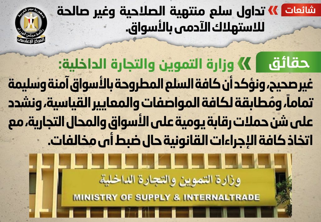 أثير في بعض وسائل الإعلام والمواقع الإلكترونية وصفحات التواصل الاجتماعي أنباء بشأن تداول سلع منتهية الصلاحية وغير صالحة للاستهلاك الآدمي بالأسواق، وقد قام المركز الإعلامي لمجلس الوزراء بالتواصل مع وزارة التموين والتجارة الداخلية، والتي نفت تلك الأنباء، مُؤكدةً أنه لا صحة لتداول سلع منتهية الصلاحية وغير صالحة للاستهلاك الآدمي بالأسواق، مُوضحةً أن كافة السلع المطروحة بالأسواق آمنة وسليمة تماماً، ومُطابقة لكافة المواصفات والمعايير القياسية، مُشددةً على شن حملات رقابة يومية على الأسواق والمحال التجارية، مع اتخاذ كافة الإجراءات القانونية حال ضبط أي مخالفات.