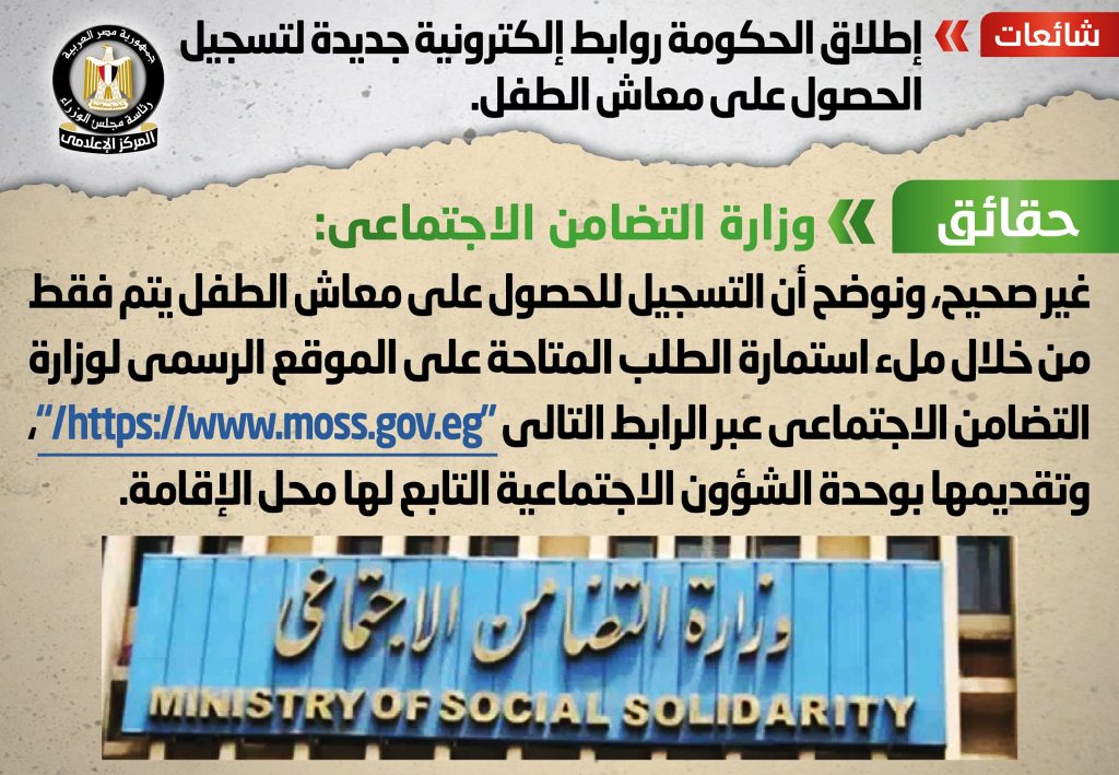 تداولت بعض المواقع الإلكترونية وصفحات التواصل الاجتماعي أنباء بشأن إطلاق الحكومة روابط إلكترونية جديدة لتسجيل الحصول على معاش الطفل، وقد قام المركز الإعلامي لمجلس الوزراء بالتواصل مع وزارة التضامن الاجتماعي، والتي نفت تلك الأنباء، مُؤكدةً أنه لا صحة لإطلاق أي روابط إلكترونية جديدة لتسجيل الحصول على معاش الطفل، وأن تلك الروابط مزيفة ولا علاقة للوزارة بها تماماً، مُوضحةً أن التسجيل للحصول على معاش الطفل يتم فقط من خلال ملء استمارة الطلب المتاحة على الموقع الرسمي لوزارة التضامن الاجتماعي عبر الرابط التالي”https://www.moss.gov.eg”، وتقديمها بوحدة الشؤون الاجتماعية التابع لها محل الإقامة.
